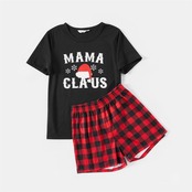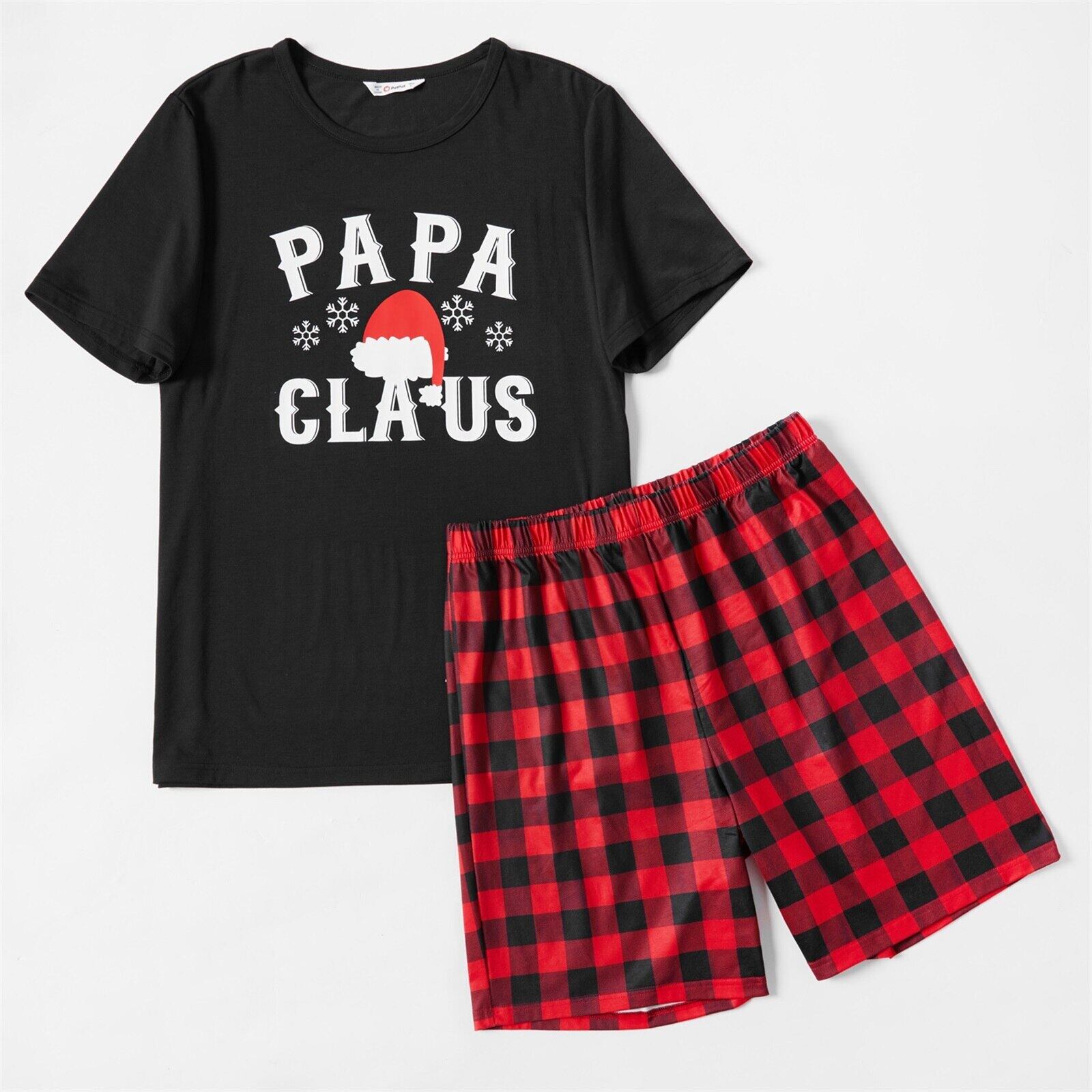 新作 PatPat クリスマスハットとレタープリント ブラック ファミリーマッチング半袖チェック柄パジャマセット (難燃性)