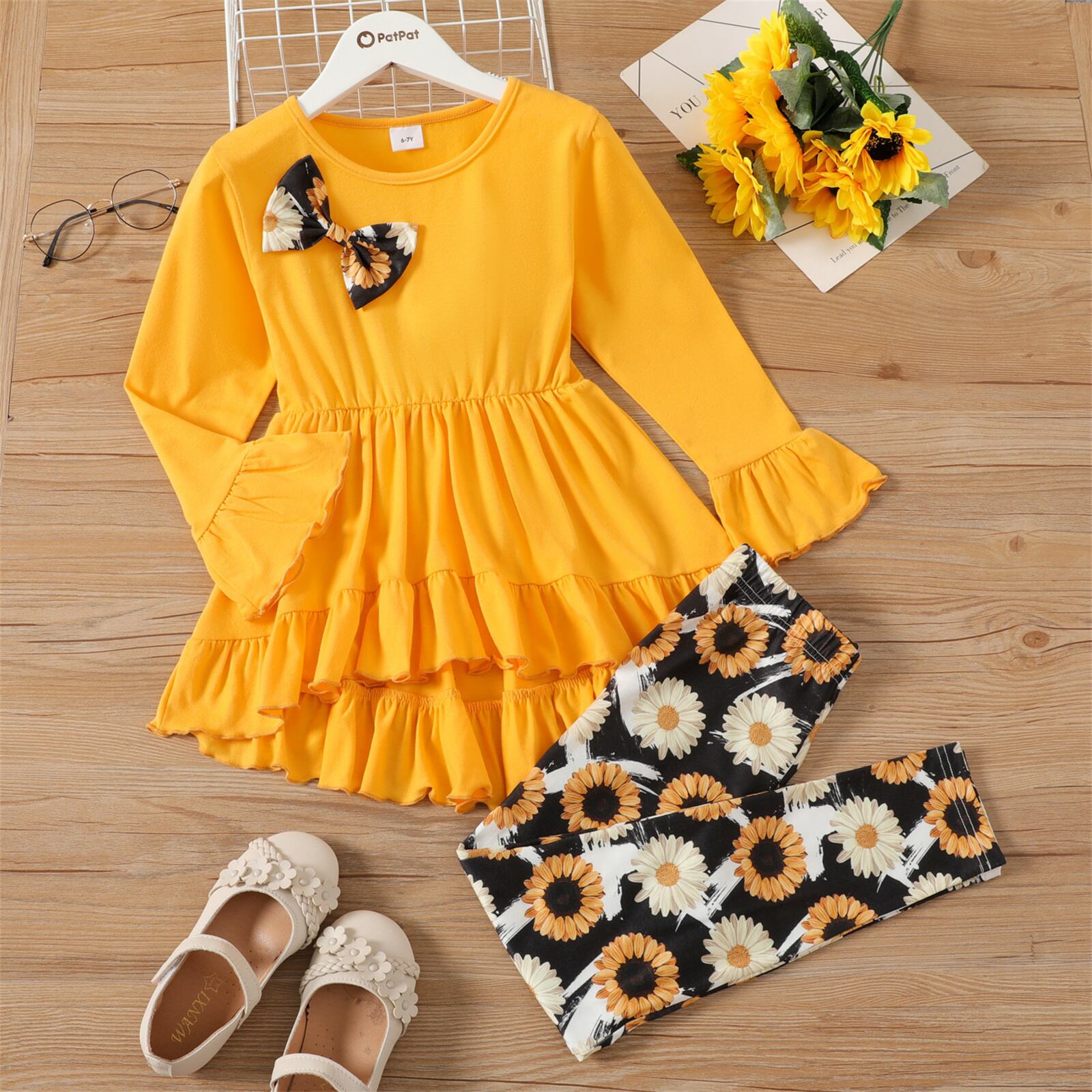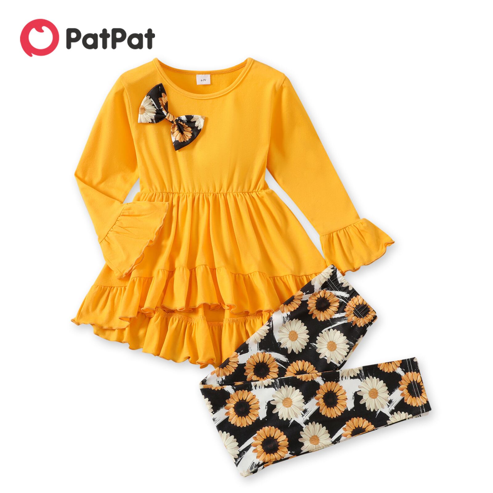 新作 PatPat 2 ピース キッド ガール ちょう結び フリル ロング ベル スリーブ ロートップとフローラル プリント レギンス セット