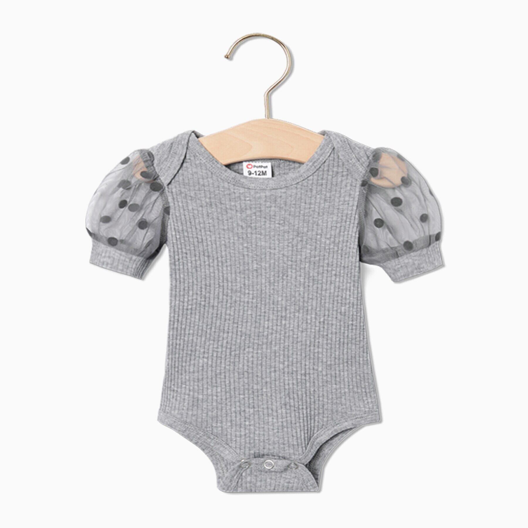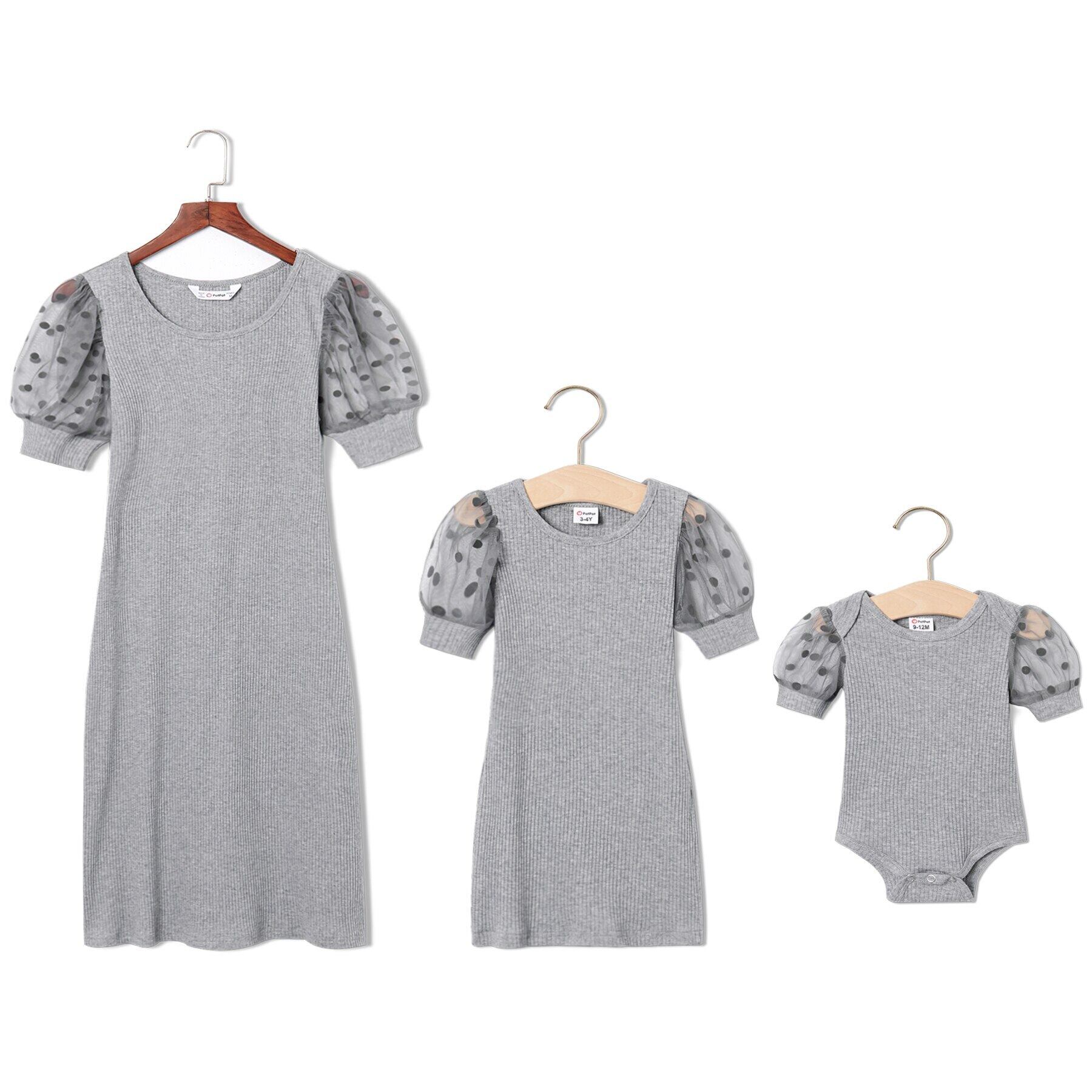 新作 PatPat水玉パフスリーブマッチングソリッドグレーミニドレス