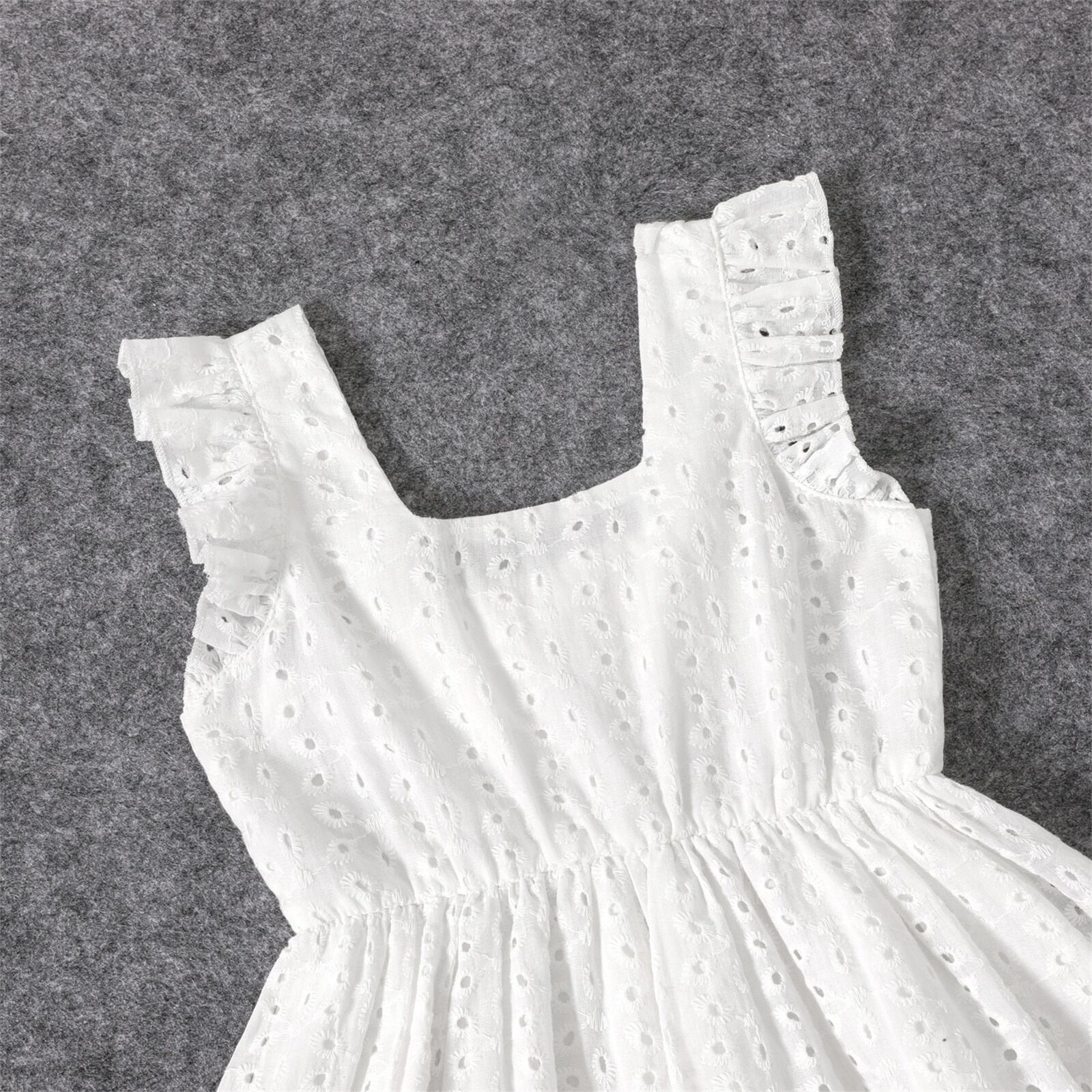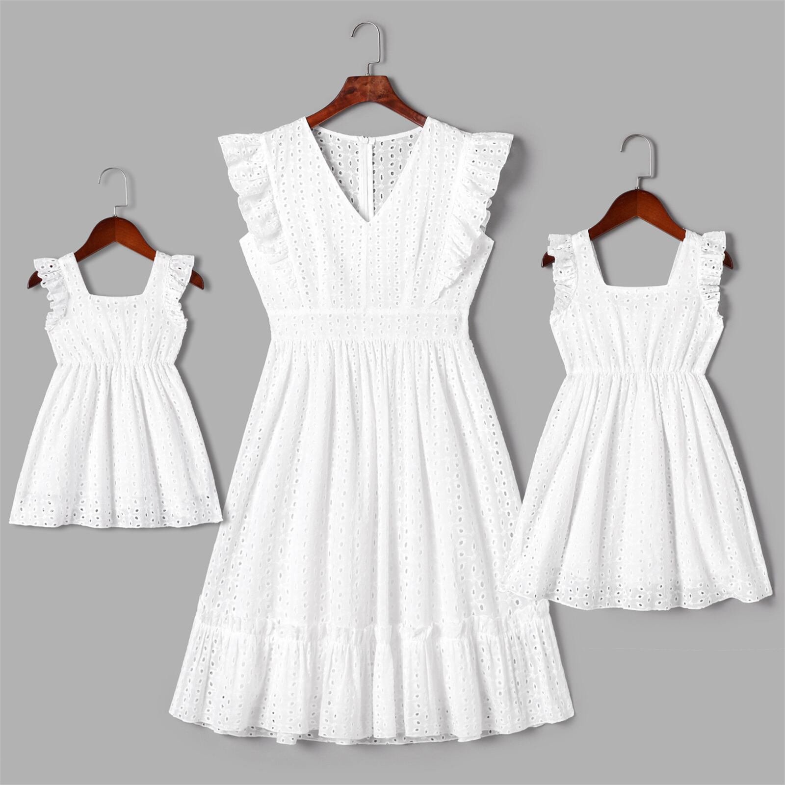 新作 PatPat 100% コットン ファミリー マッチング衣装 ホワイト 中空アウト フローラル 刺繍 フリル ノースリーブ ドレス ママとミーのドレス