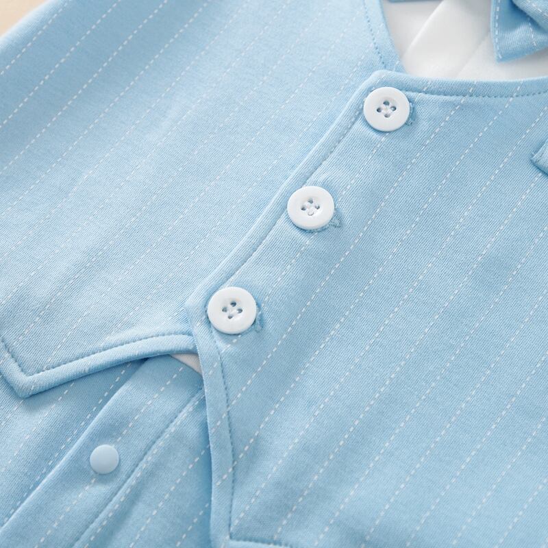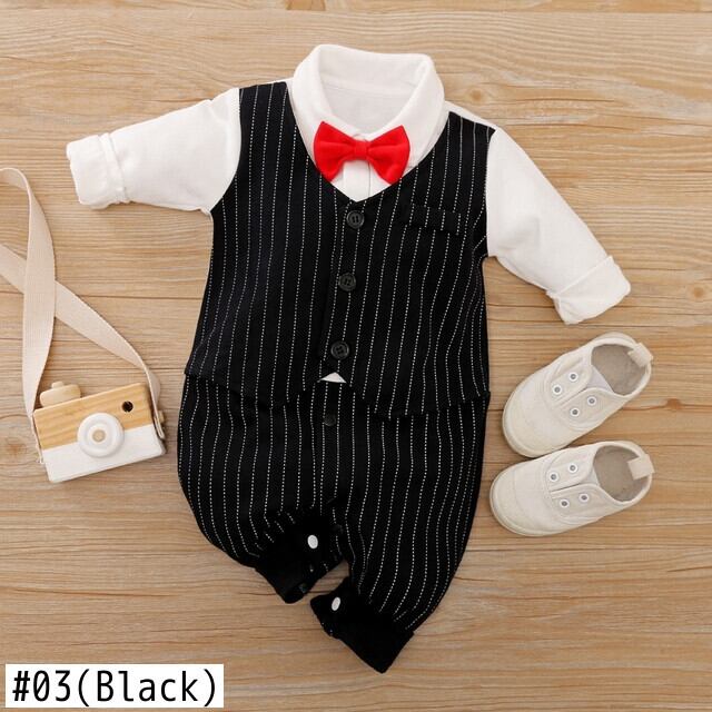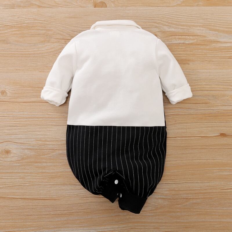 新作 PatPat 綿 100% 男の赤ちゃん紳士ストライププリント蝶ネクタイの装飾長袖ベビージャンプスーツワンピースボディスーツ服