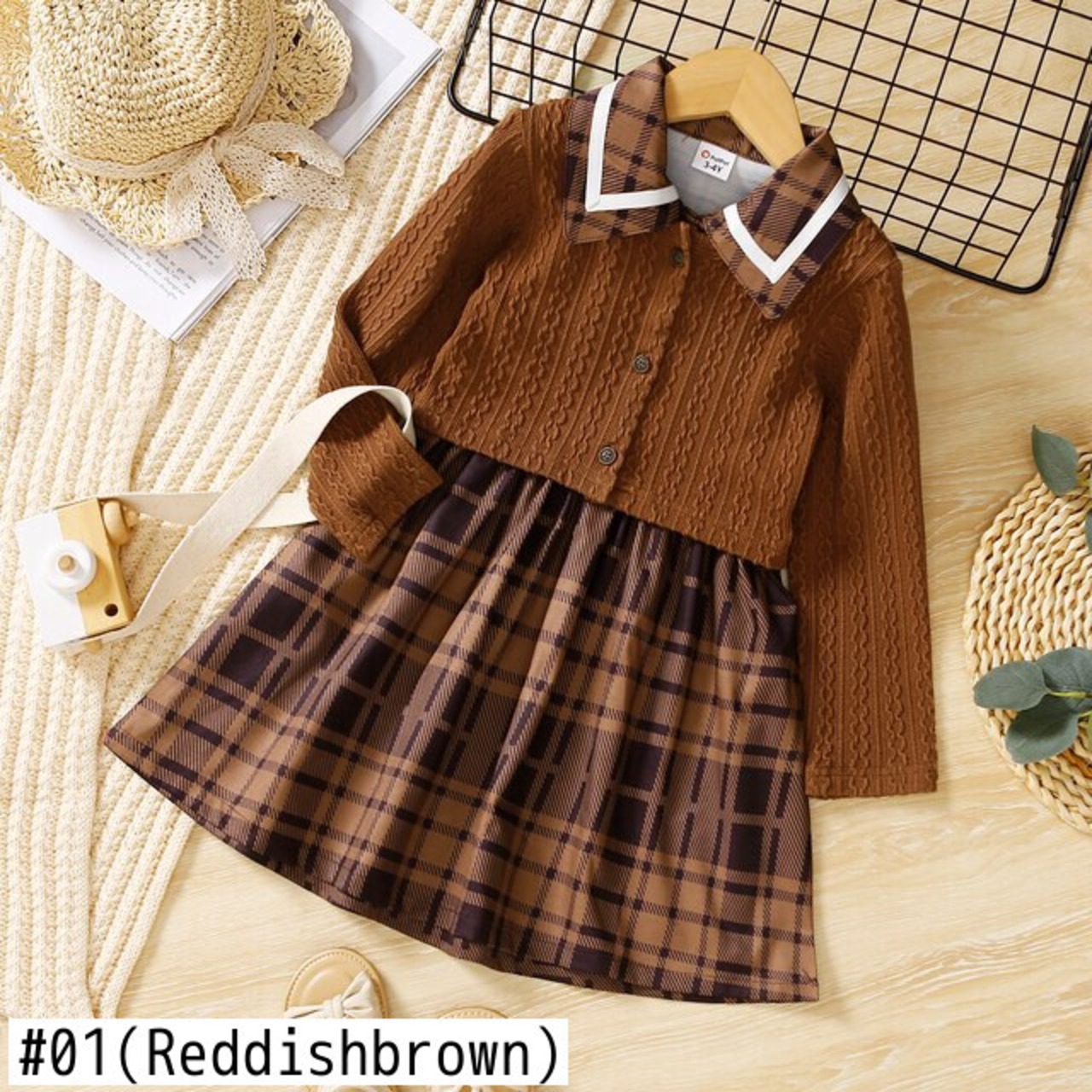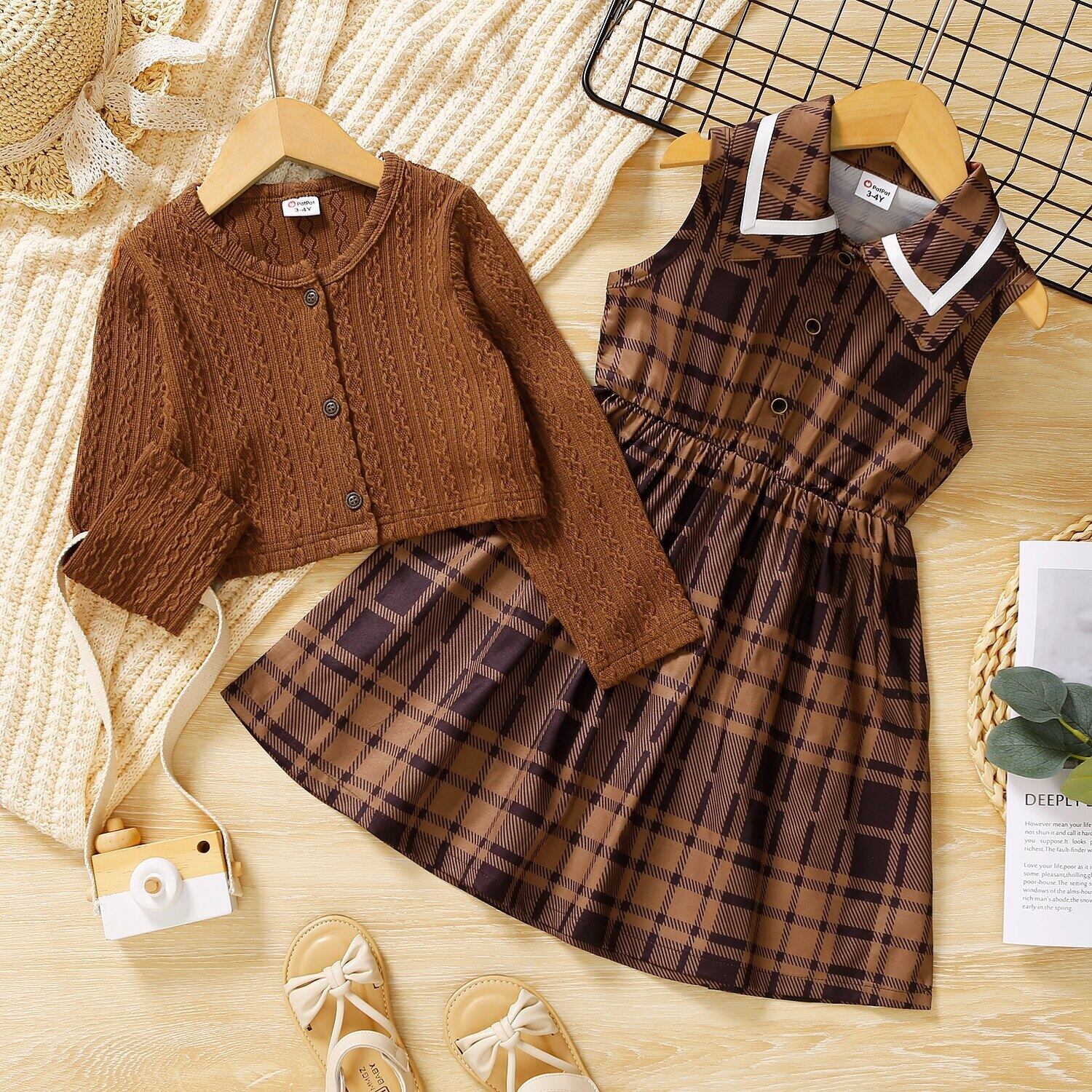 新作 PatPat 2ピース幼児女の子ラペルカラーチェック柄ノースリーブドレスとケーブルニット長袖カーディガンセット