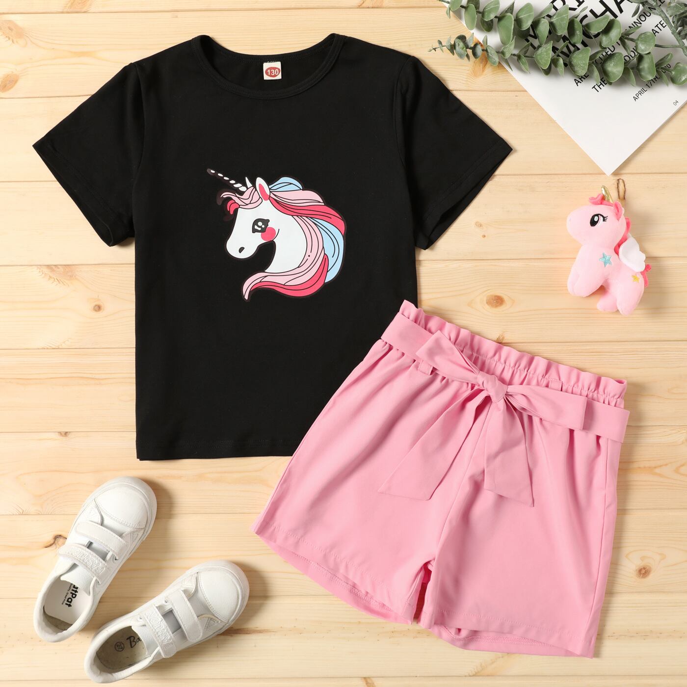 新作 PatPat 2 ピース キッド ガール ユニコーン プリント 半袖 ブラック T シャツとベルト付きペーパーバッグ ショーツ セット