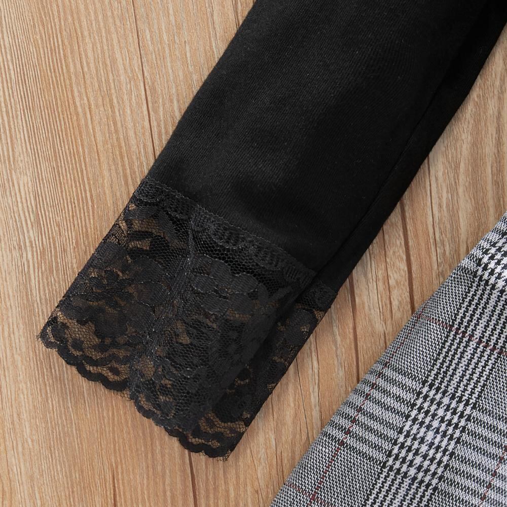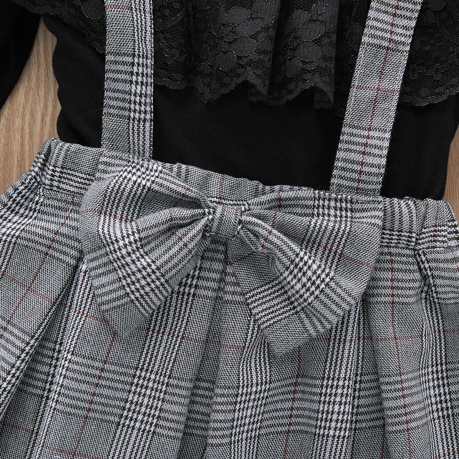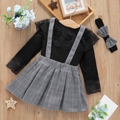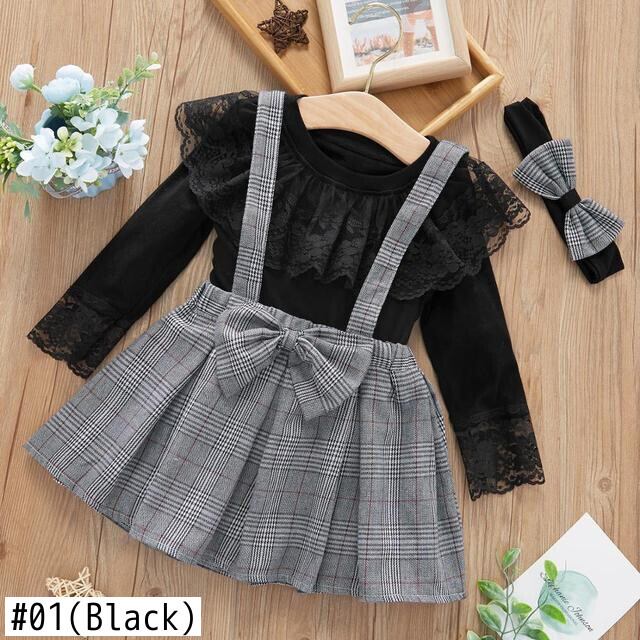 新作 PatPat 3ピース ベビー/幼児用 ブラック レーストップとチェック柄オーバーオールセット ヘッドバンド付き 女の赤ちゃん