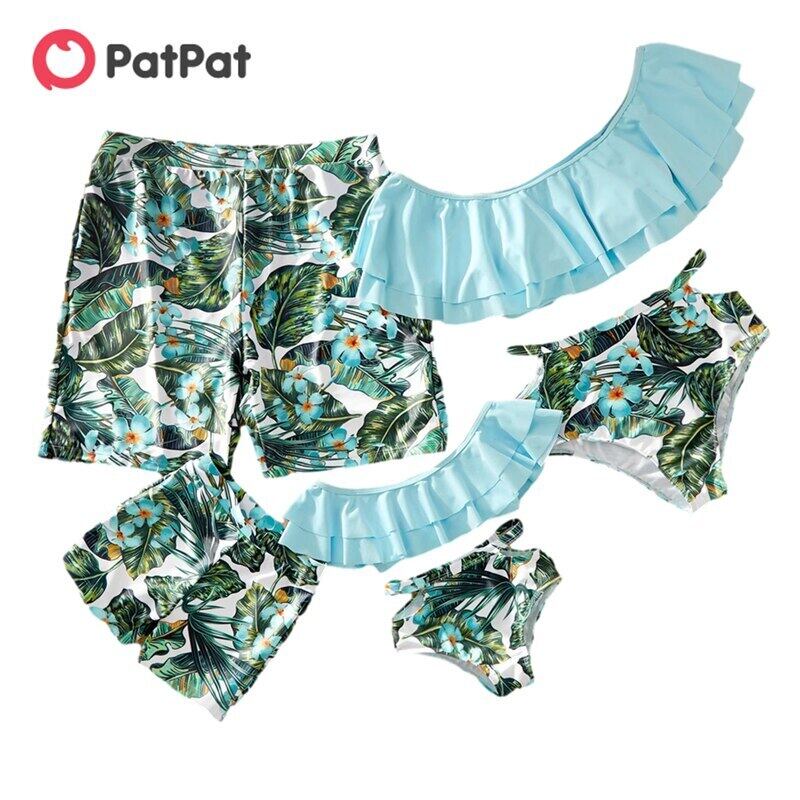 新作 PatPat 2021年夏 オフショルダー フラウンス 植物柄 お揃い水着 ファミリールック 家族お揃い