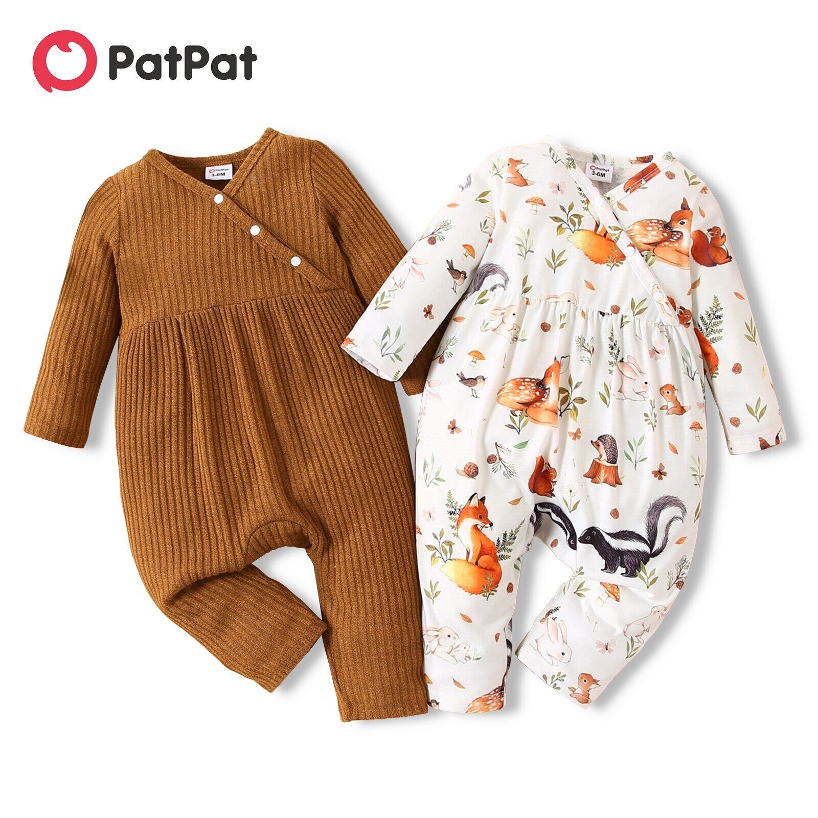 新作 PatPat ベビーガール リブ ブラウン/ホワイト 全体にアニマルプリント Vネック 長袖 ジャンプスーツ