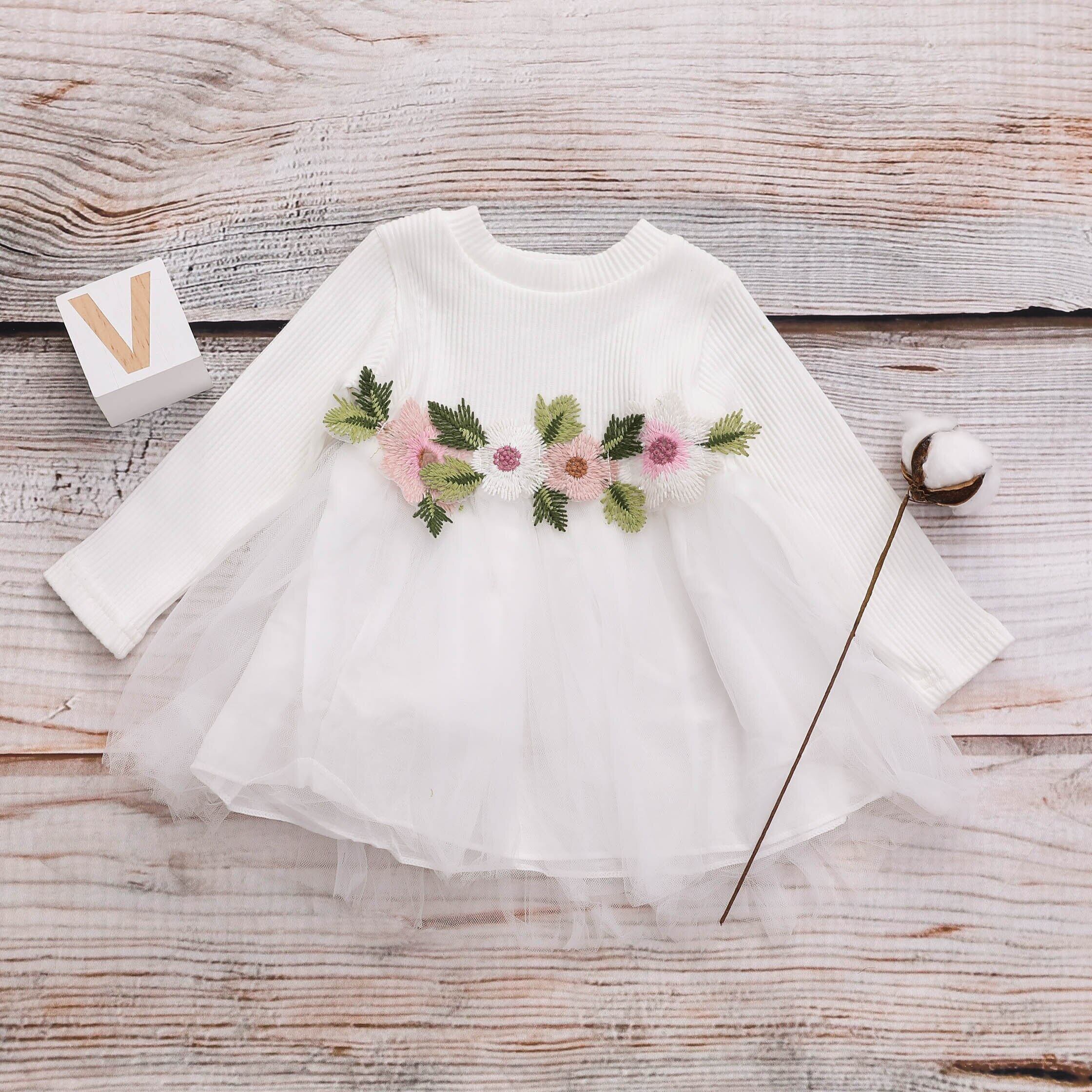 新作 ジャージーコットン 長袖 チュチュワンピース 花飾り ウエスト ベビー・幼児 女の子