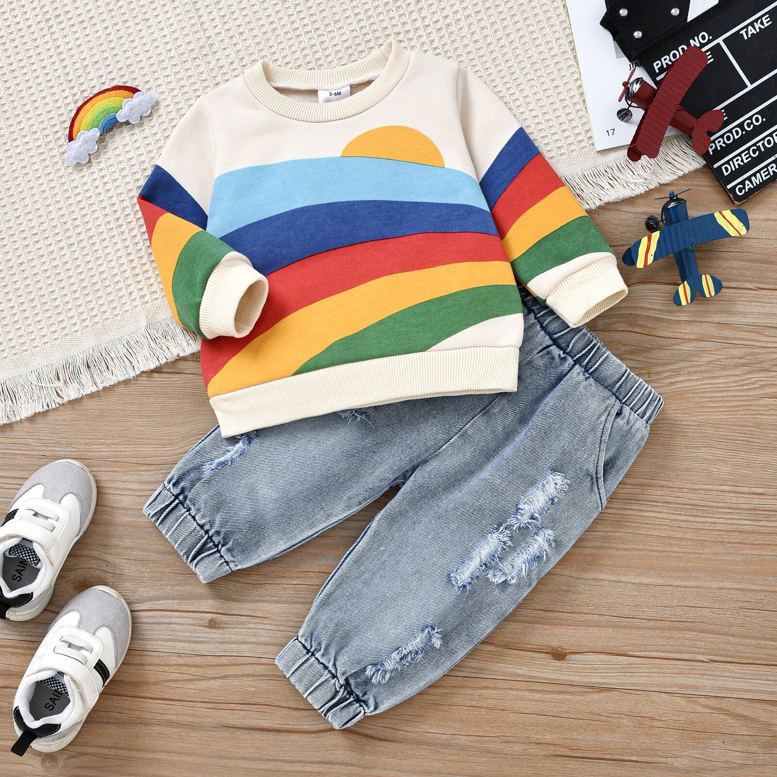 新作 PatPat 2ピース ベビーボーイ/ガール レインボー ロングスリーブ スウェットシャツ コットン100% デニム リップドジーンズセット