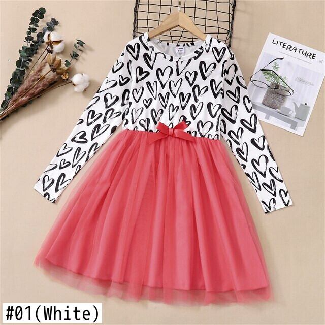 新作 PatPat キッド ガール レター/ハート プリント ちょう結び メッシュ スプライス 長袖 ドレス
