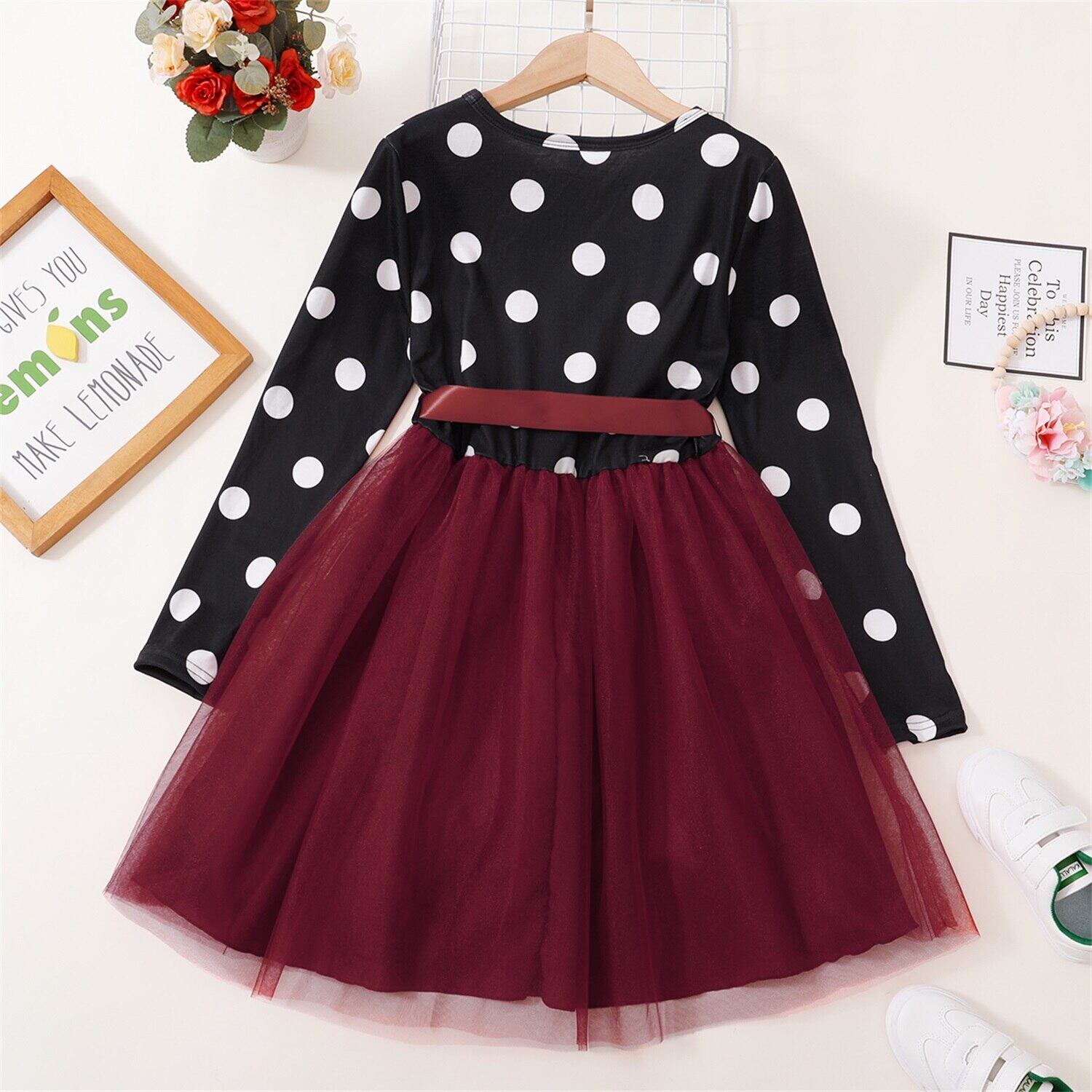 新作 PatPat Kid Girl 水玉ステッチちょう結び長袖メッシュドレス