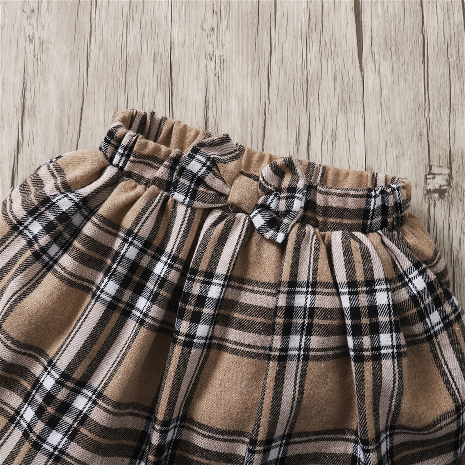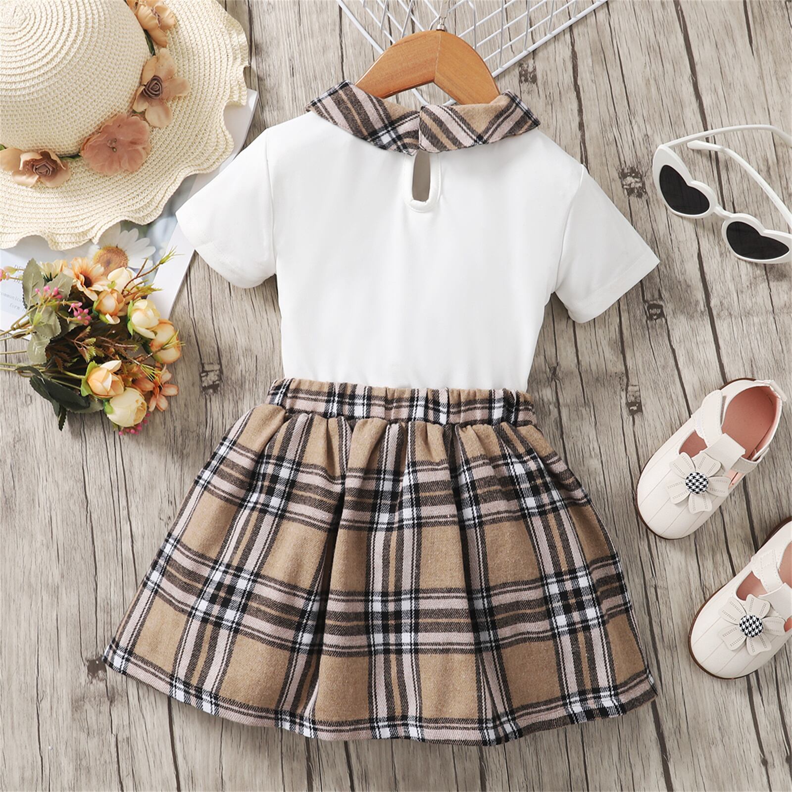 新作 PatPat 2ピース 幼児 女の子 人形 首輪 クマ プリント 半袖Tシャツとちょう結び チェック柄スカートセット
