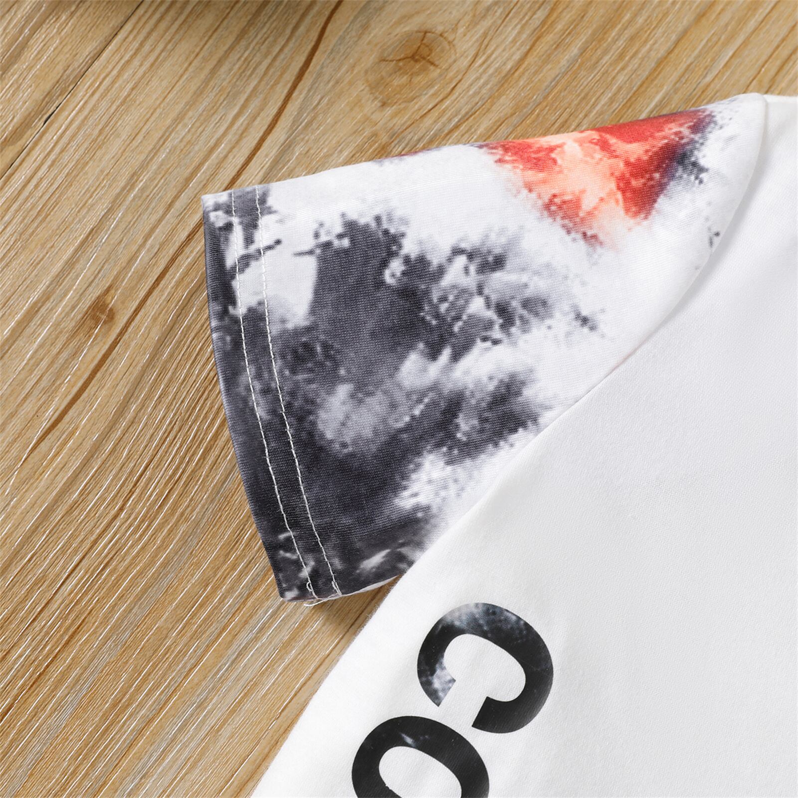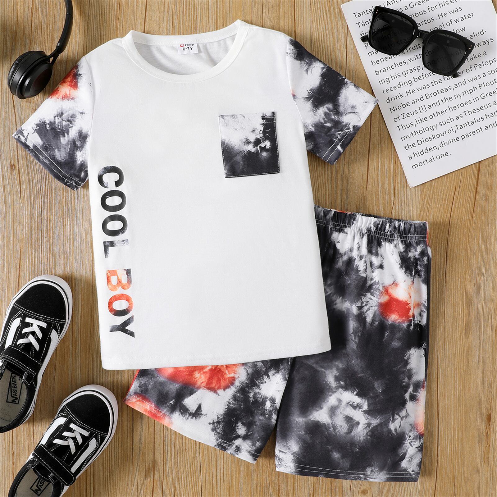 新作 PatPat 2ピース キッド ボーイ カラーブロック タイダイ レタープリント 半袖Tシャツと伸縮性ショーツセット