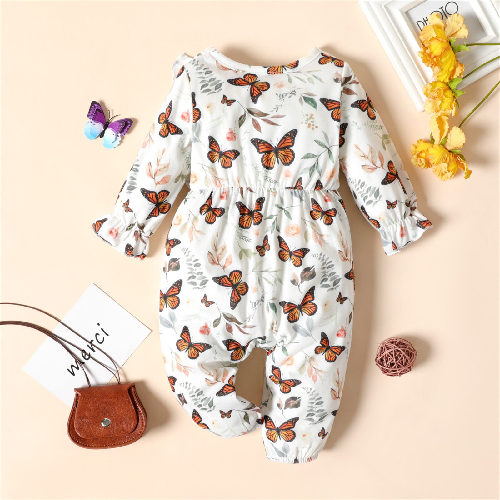 新作 PatPat ベビーガール ブラウン/ホワイト バタフライ プリント 長袖 フリル ジャンプスーツ