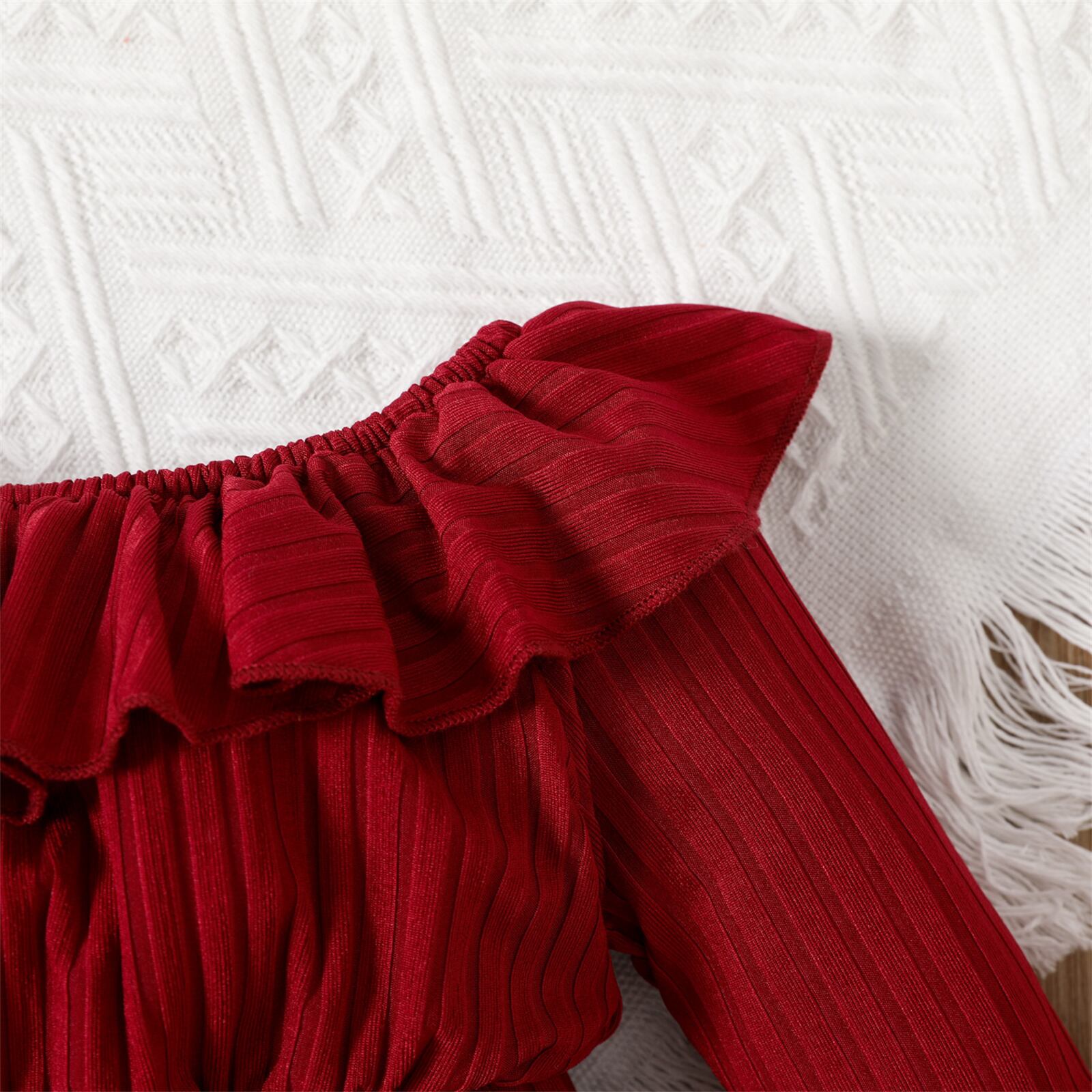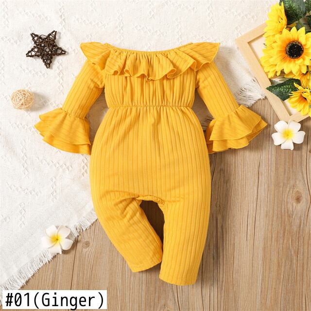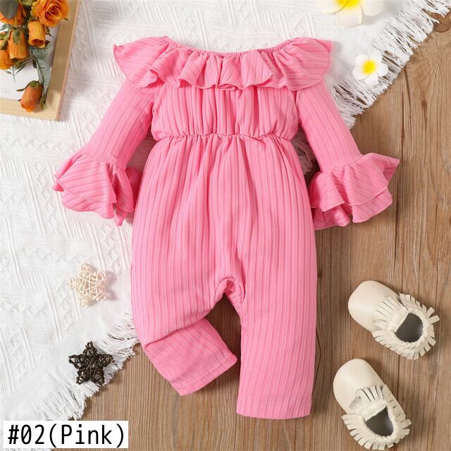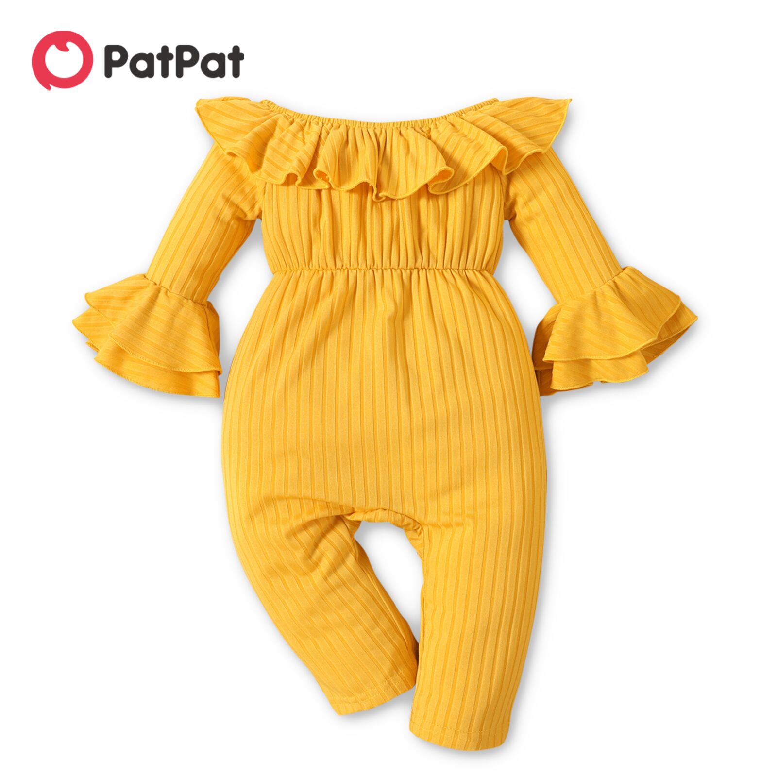 新作 PatPat ベビー 女の子 無地 リブ オフショルダー フリル ベルスリーブ ジャンプスーツ