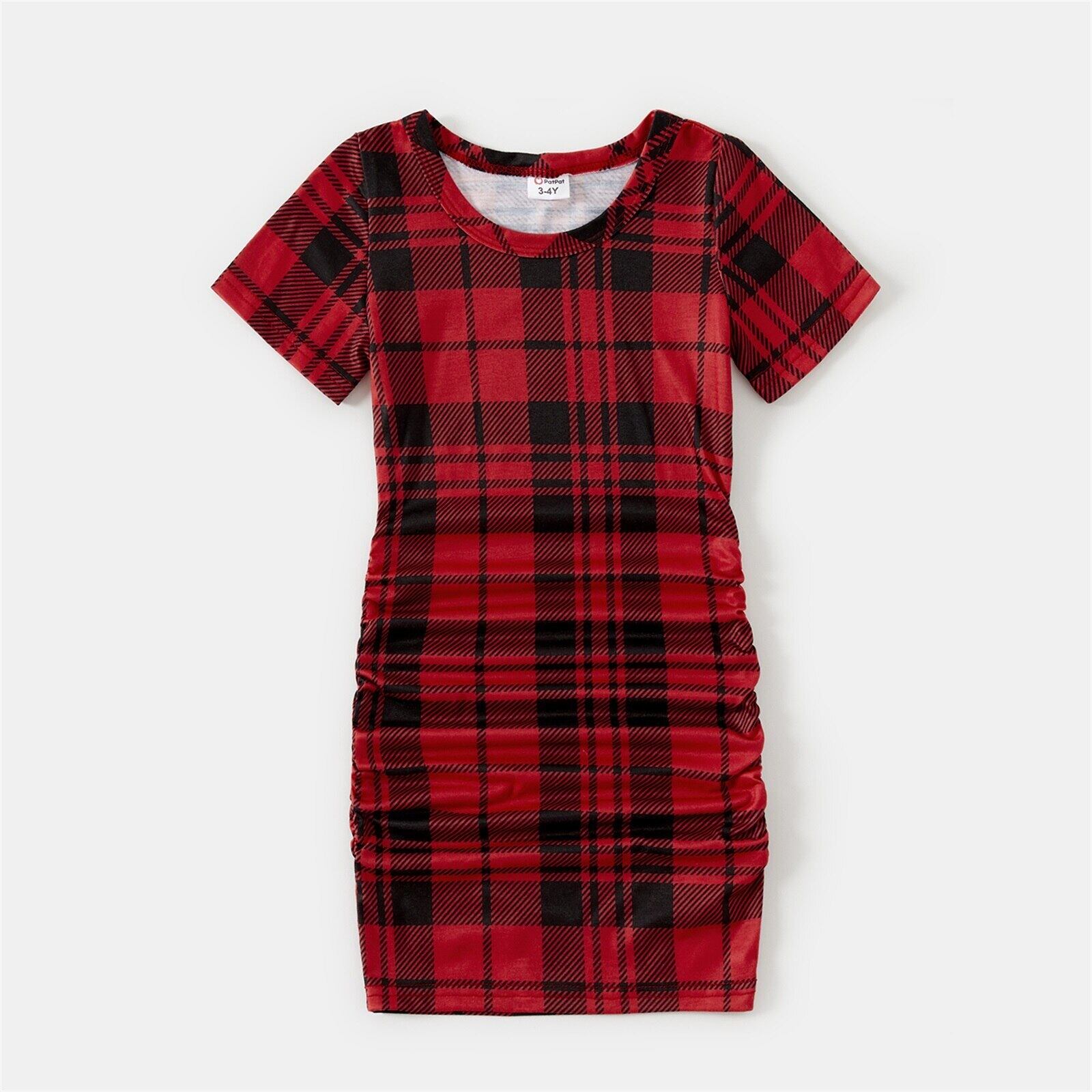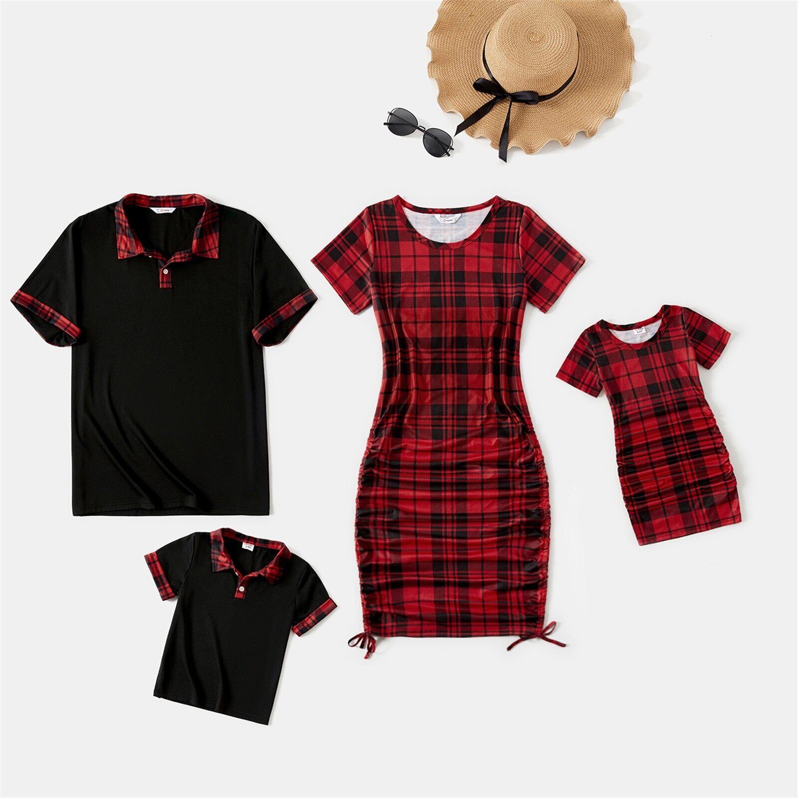 新作 PatPat ファミリーマッチングレッドチェック柄半袖ミニドレスとポロシャツセット
