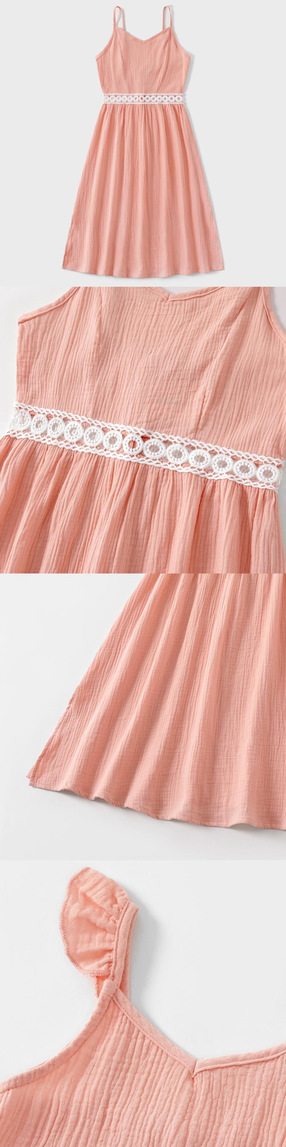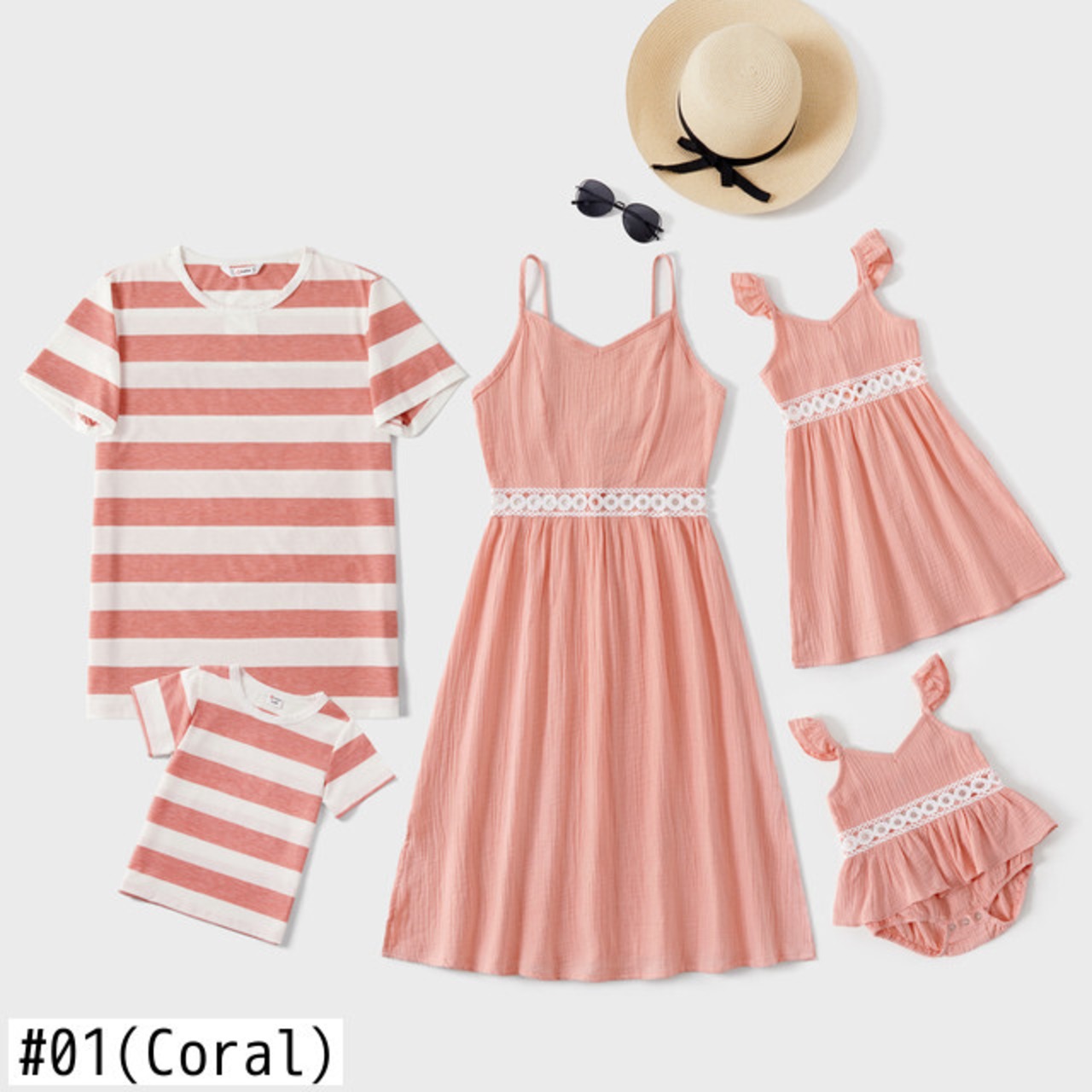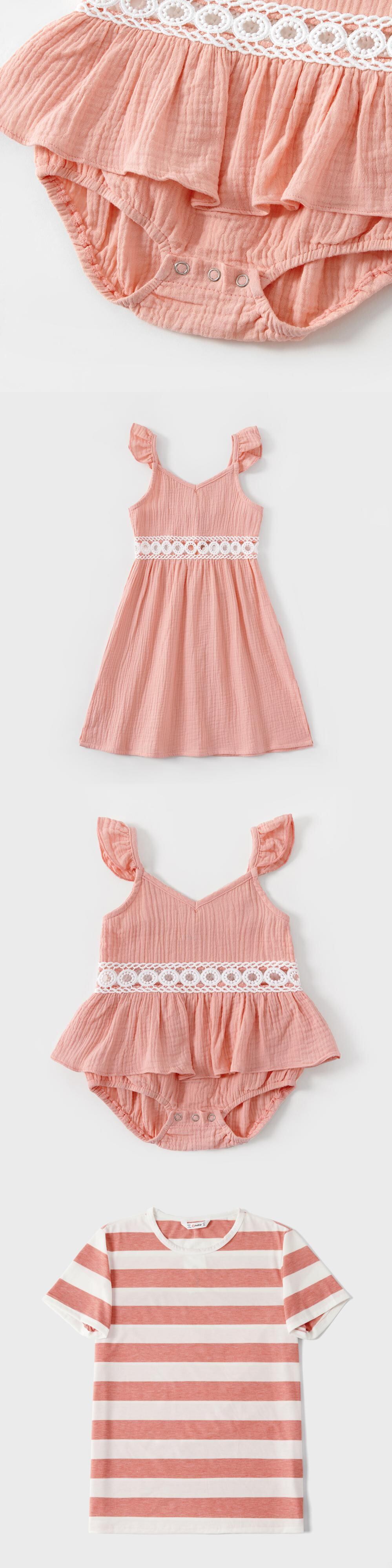 新作 PatPat 2021 夏モザイクファミリーマッチングコットン中空アウトレースフラッタースリーブタンクドレスストライプ Tシャツ