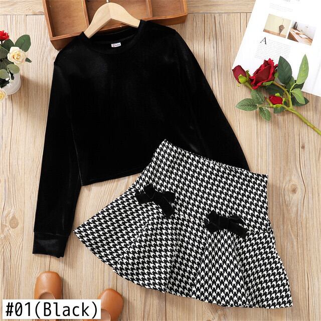 新作 PatPat 2 ピース キッド ガール ベルベット ロングスリーブ ブラック トップとちょう結び千鳥格子スカート セット