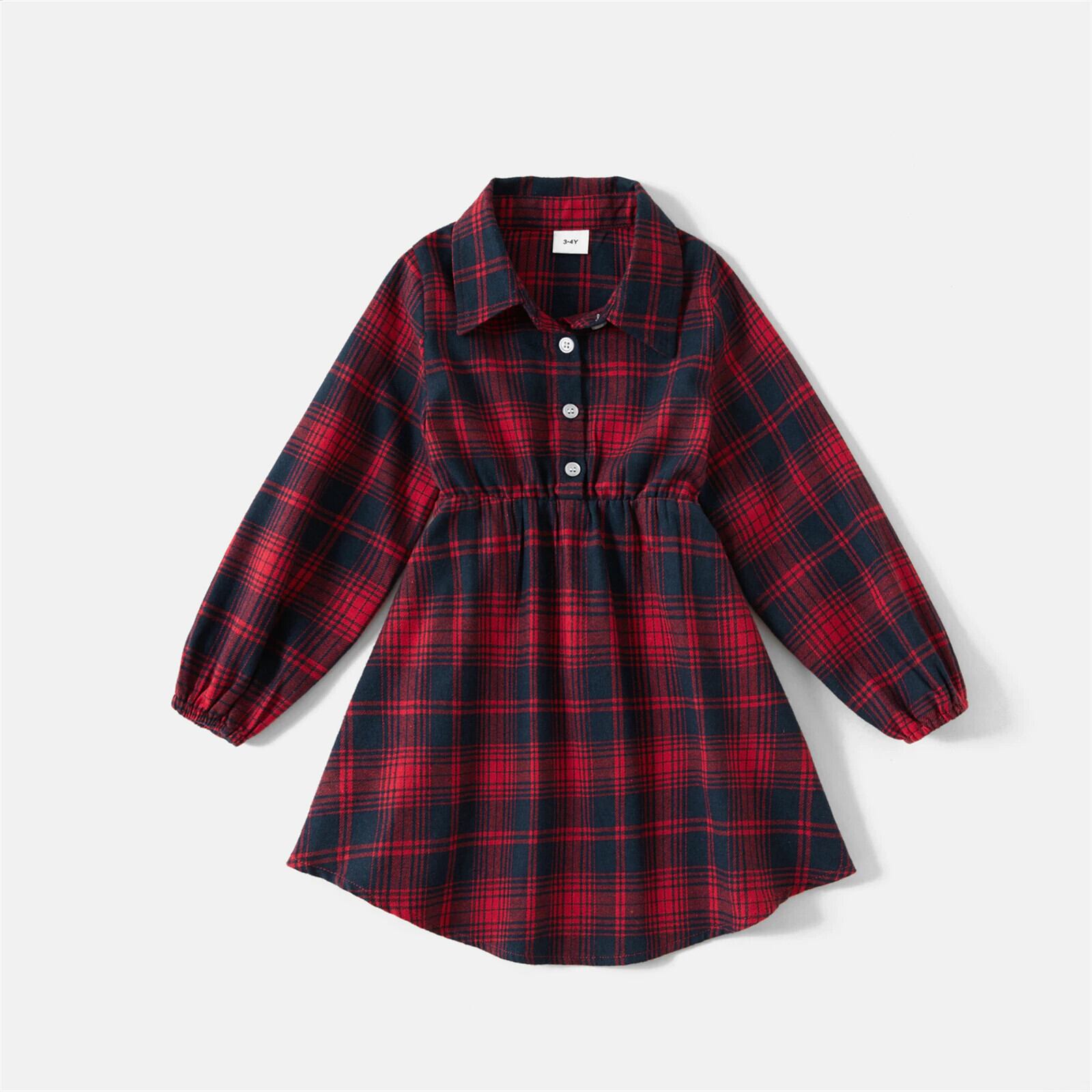 新作 PatPat 赤チェック柄の襟付き家族おそろいセット(前ボタン長袖シャツ or ミディドレス)