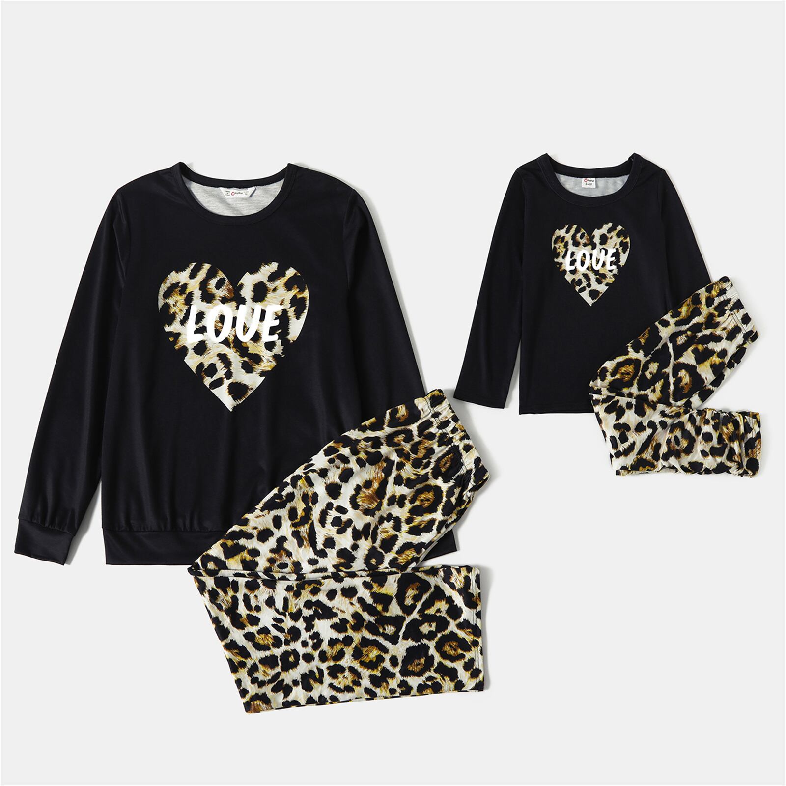 新作 PatPat Love Heart レタープリント ブラック 長袖 スウェットシャツ ヒョウパンツセット ママと私