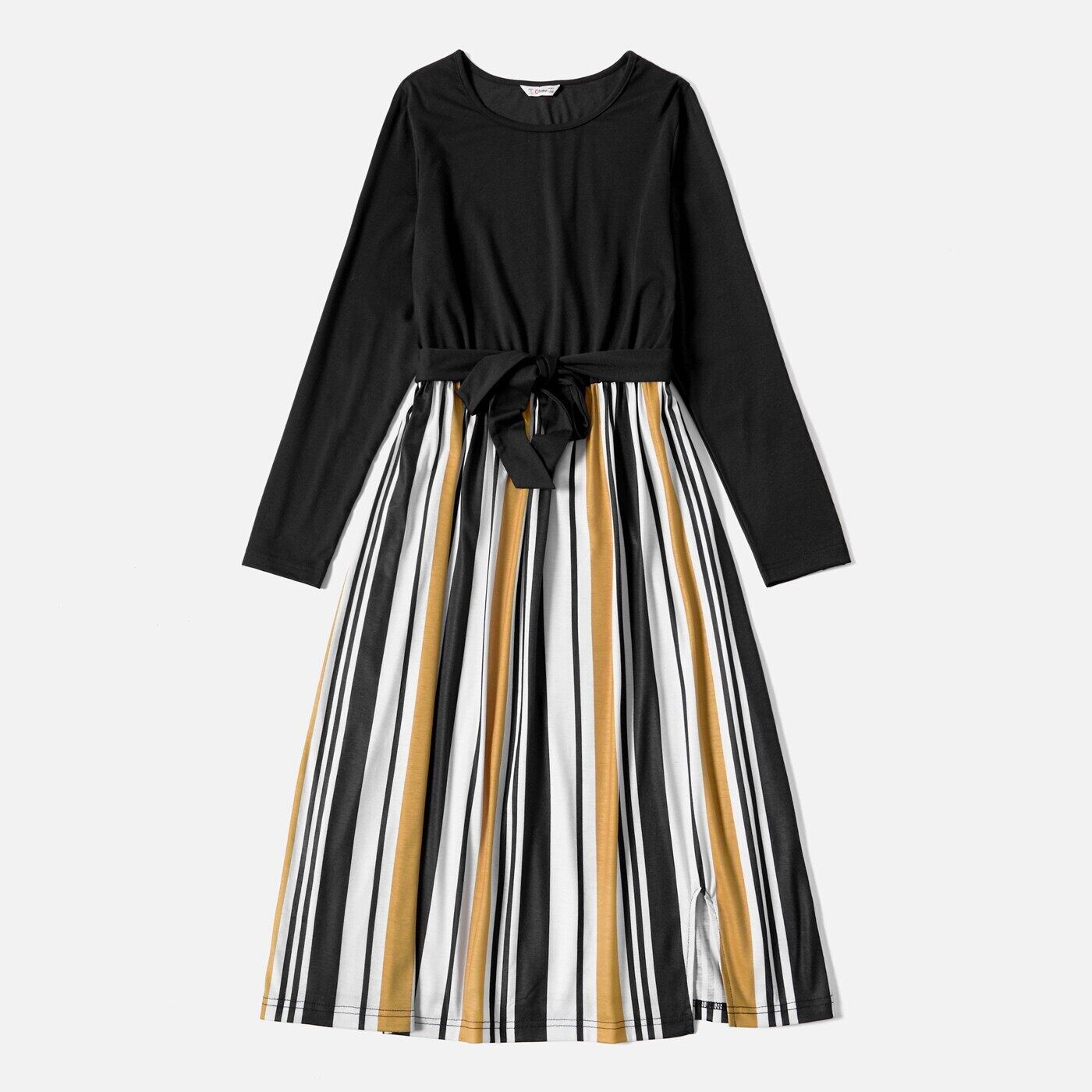 新作 PatPat ブラック ロングスリーブ スプライシング ストライプ ミディ ドレス ママと私
