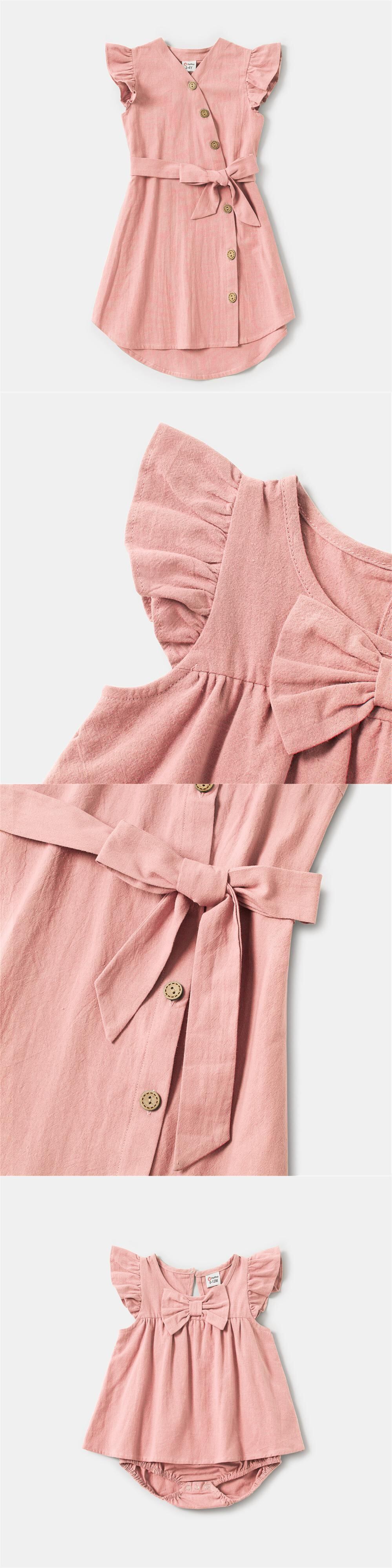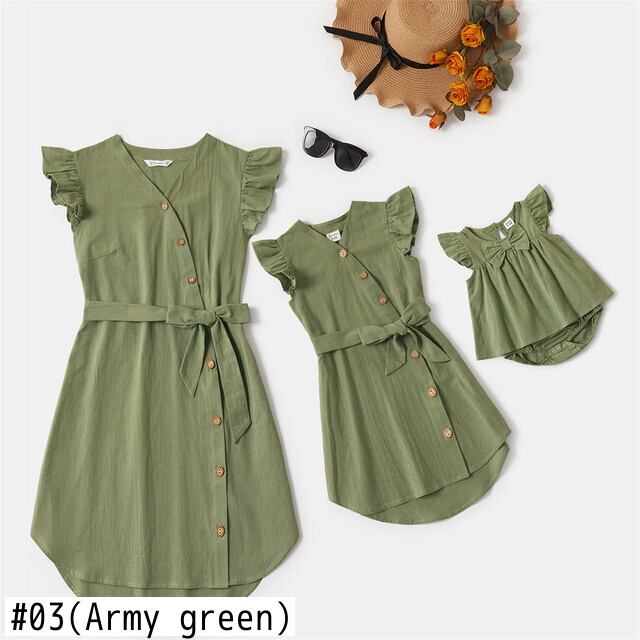 新作 PatPat 100% コットン 無地 フラッタースリーブ マッチング グリーン/ピンク/アーミーグリーン ミディドレス ファミリーマッチング ママ キッズ ファミリールック服