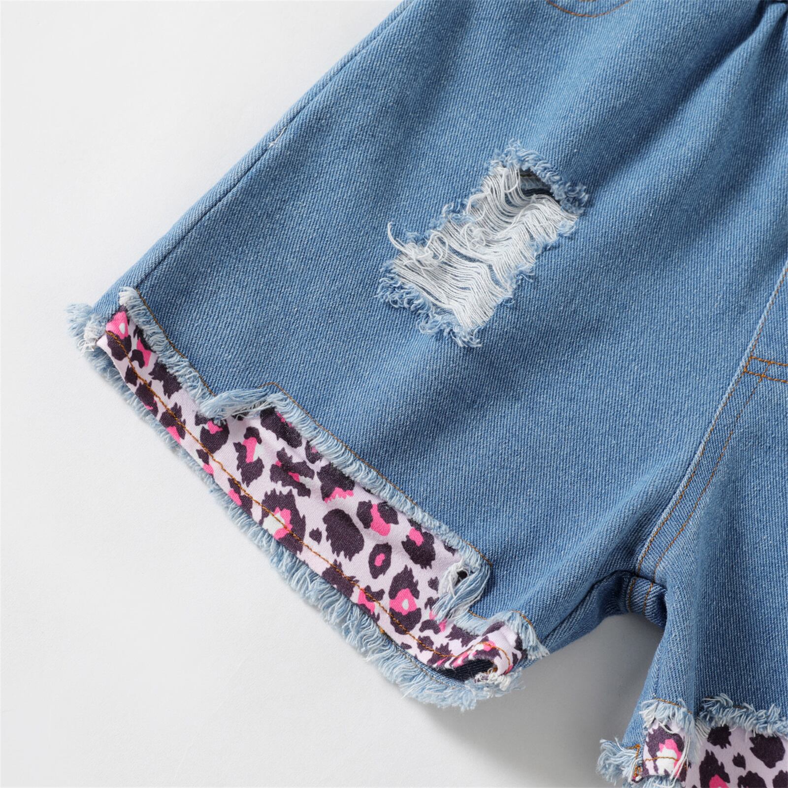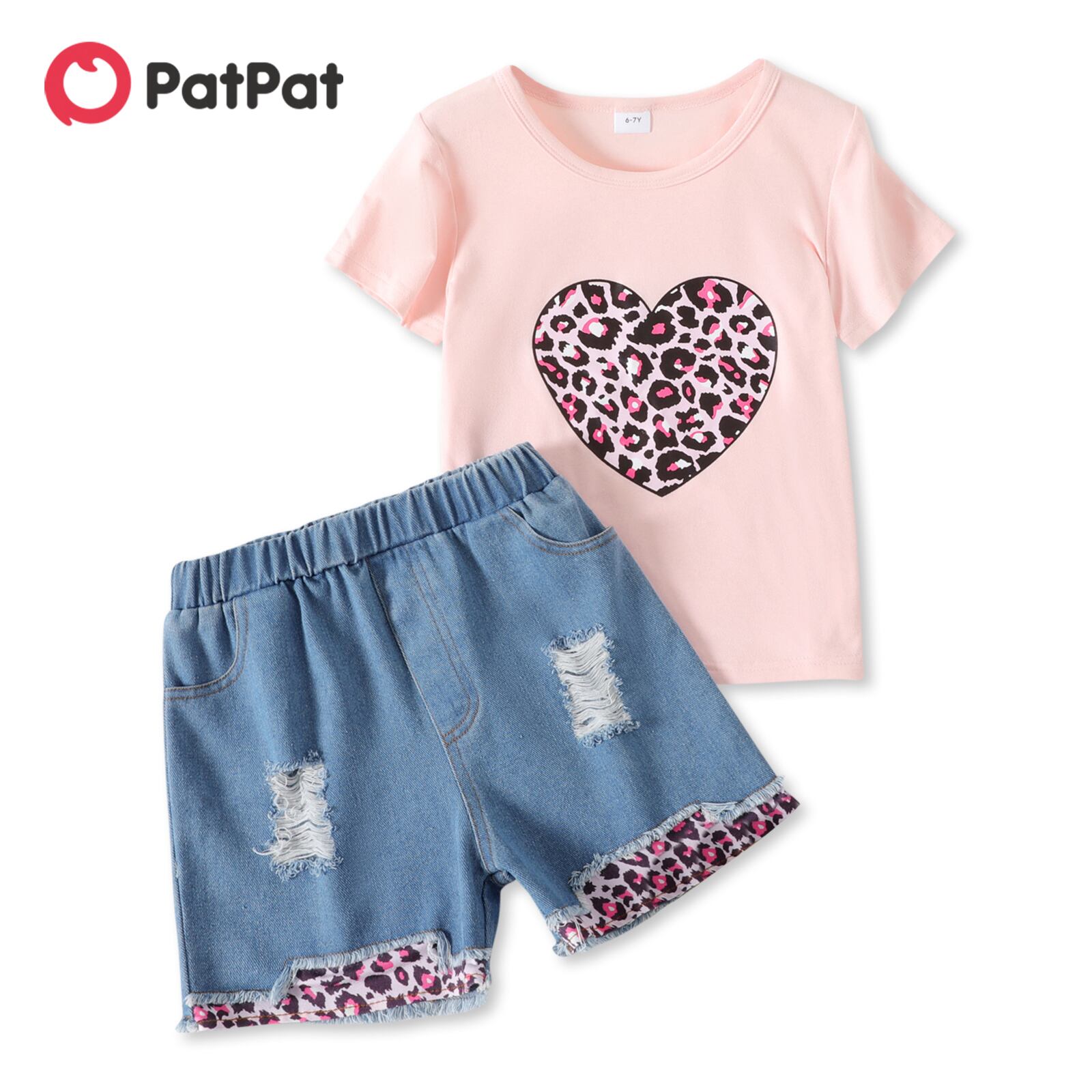 新作 PatPat 2 ピース キッド ガール ヒョウ ハート プリント T シャツとリップド デニム ショーツ セット