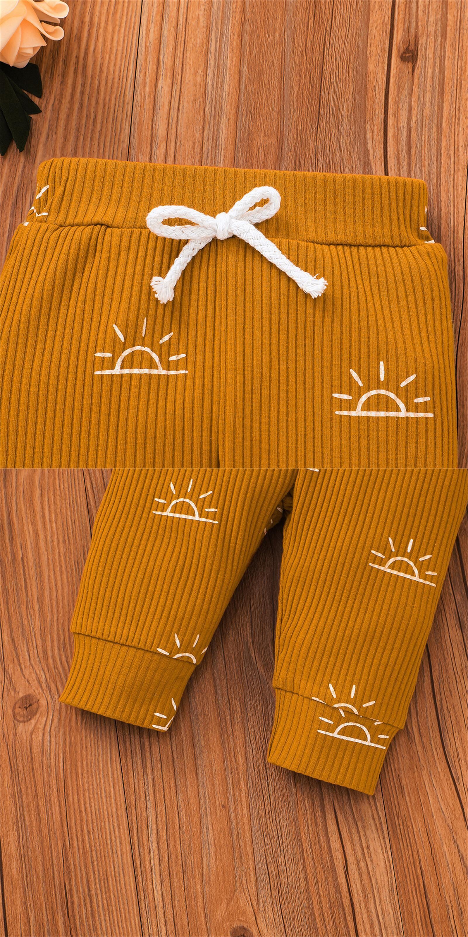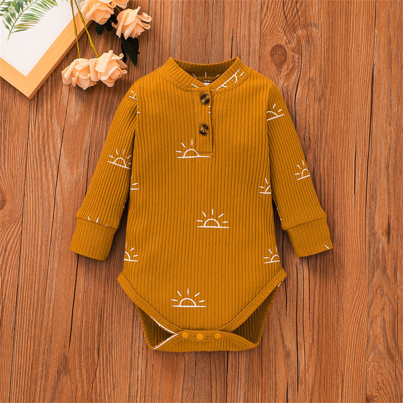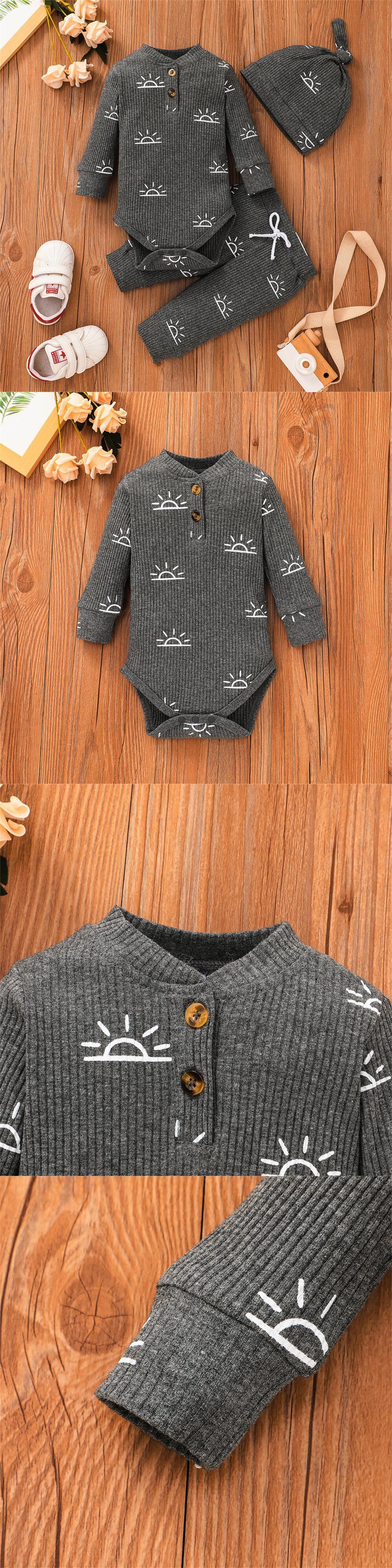 新作 PatPat 3ピース ベビー 男の子 太陽 プリント ボタン リブ 長袖 ロンパース 伸縮パンツ キャップ セット