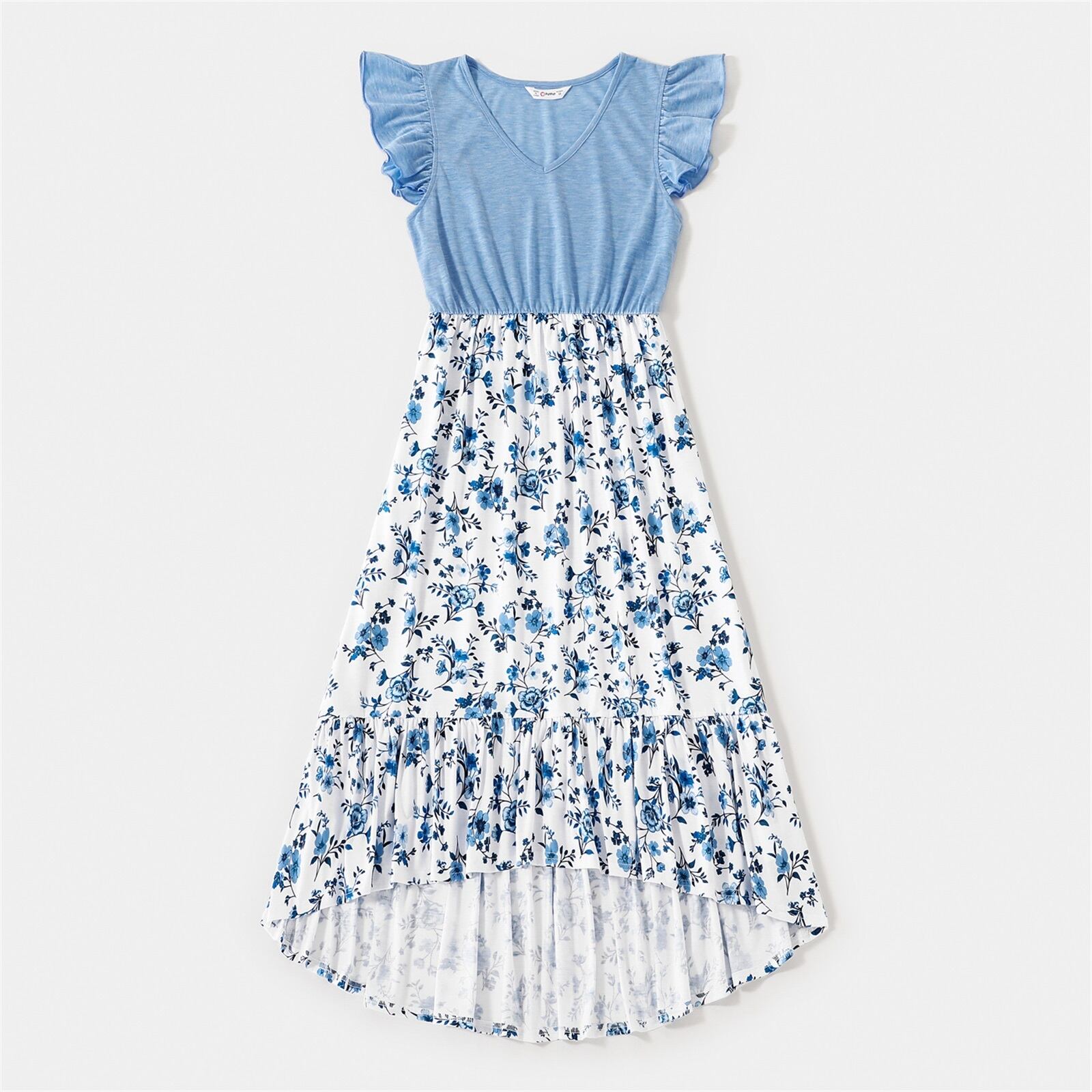 新作 PatPatファミリーマッチングライトブルーVネックフラッタースリーブスプライシングフローラルプリントイレギュラーヘムドレスとストライプTシャツセット