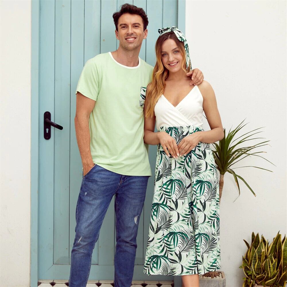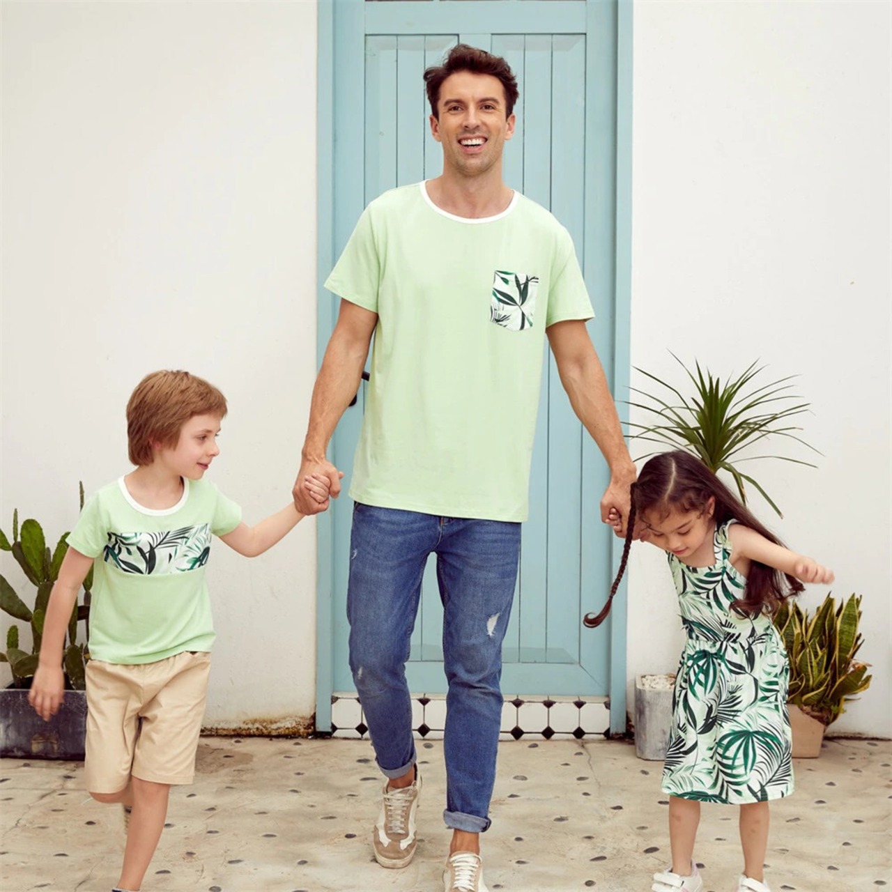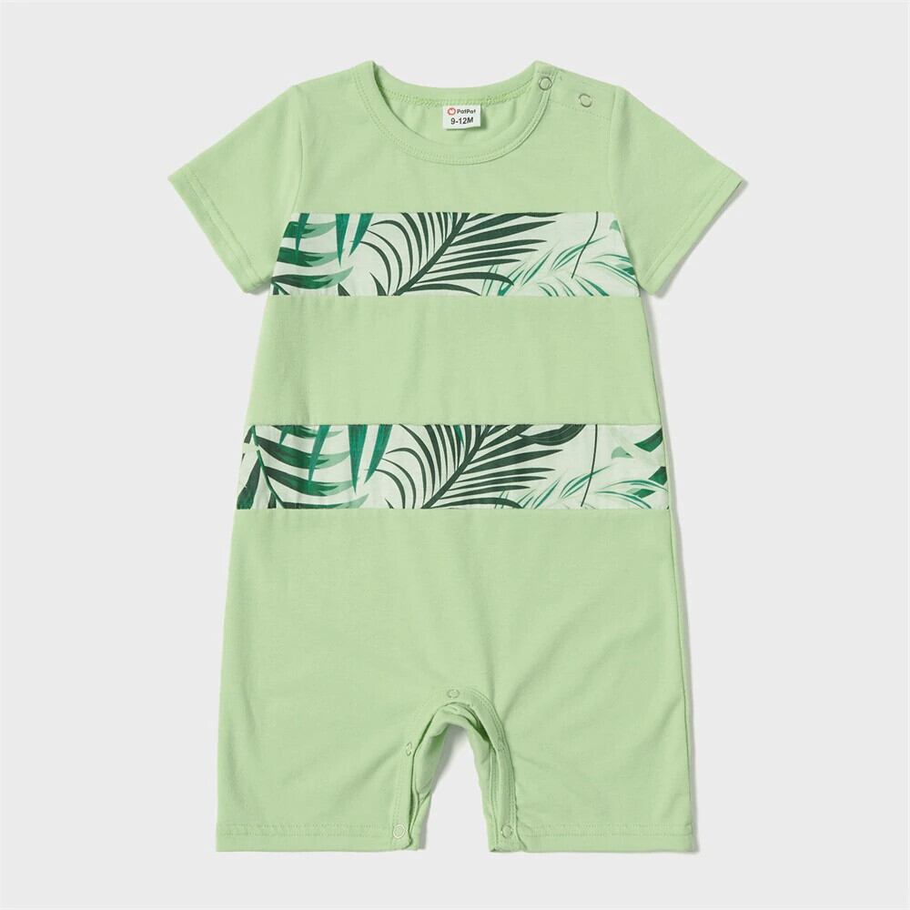 新作 PatPat ファミリールック カジュアル フローラル ペールグリーン マッチングスーツ モザイク リーフプリント グリーン セット