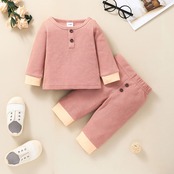 新作 幼児キッズベビーガールズリブ固体パジャマセットトップ秋ズボン長袖弾性子供睡眠服 3-24M