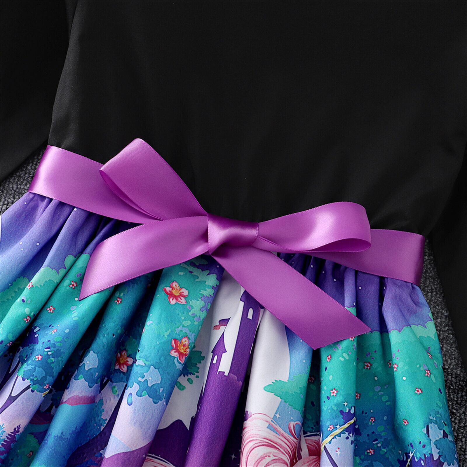 新作 PatPat Kid Girl ユニコーン プリント スプライス カラーブロック ベルト付き 長袖ドレス