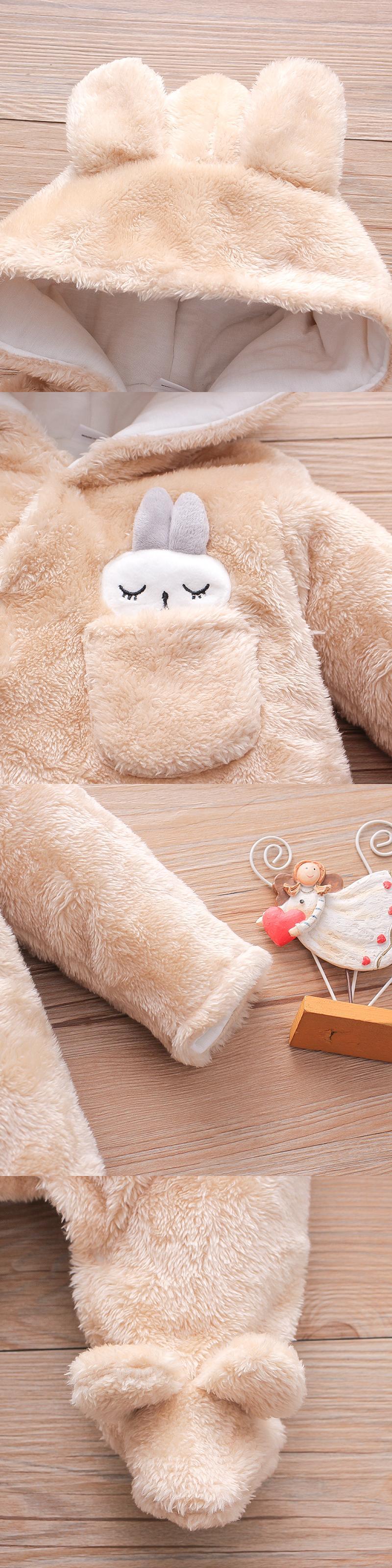 新作 PatPat 冬 ベビー ソリッド フリース ウサギ フード付き ジャンプスーツ ベビー ユニセックス スウィート ジャンプスーツ 男の子 / 女の赤ちゃん 服