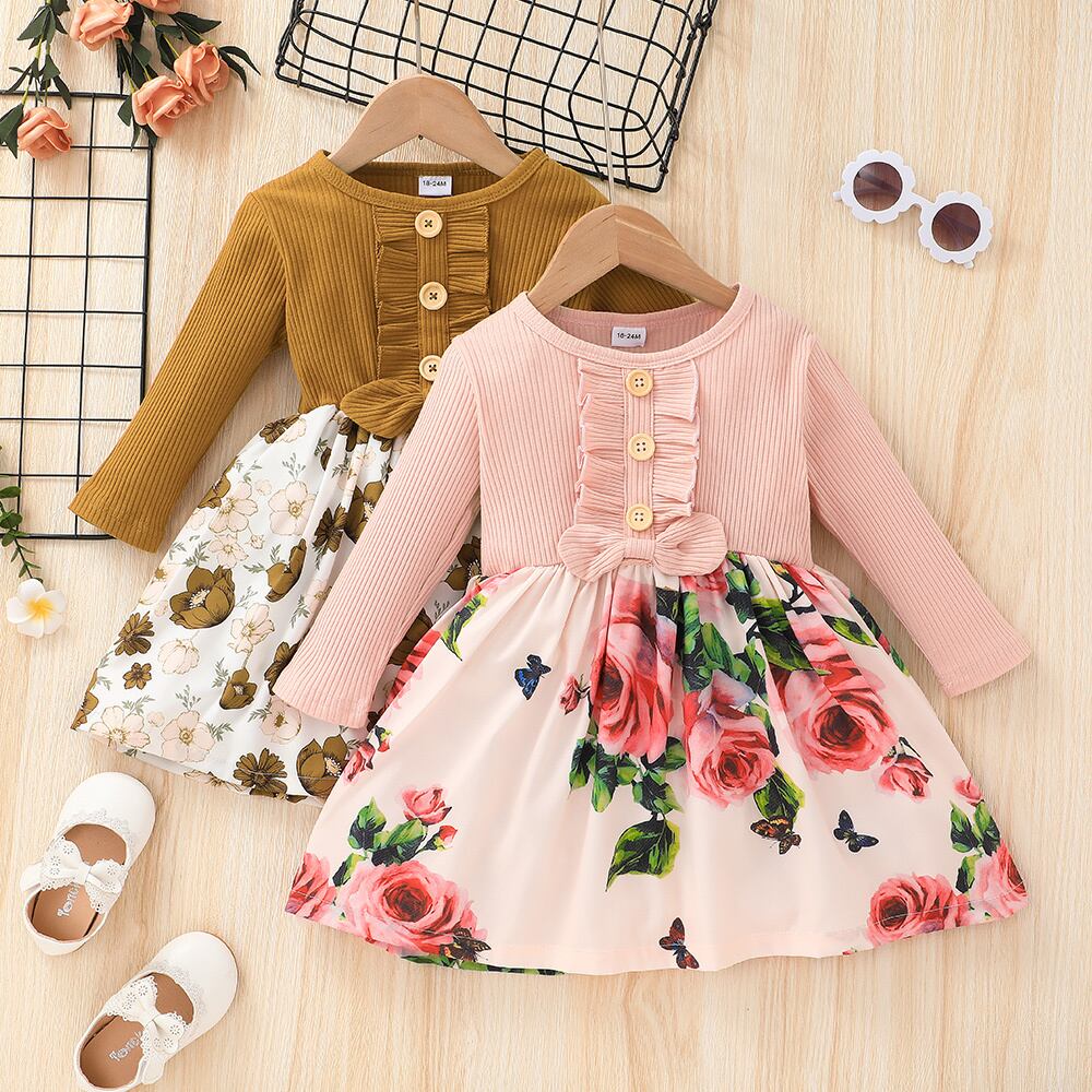 新作 PatPat 2021 春と秋のベビー幼児女の子フラワー プリント スプライス長袖ドレス子供の