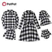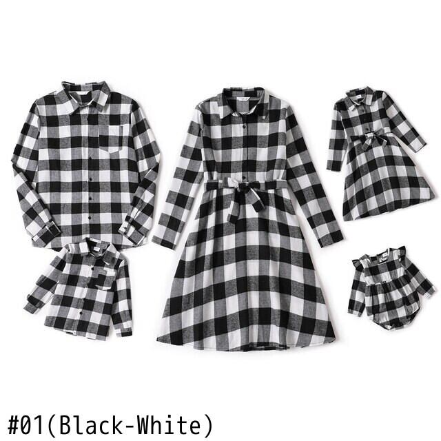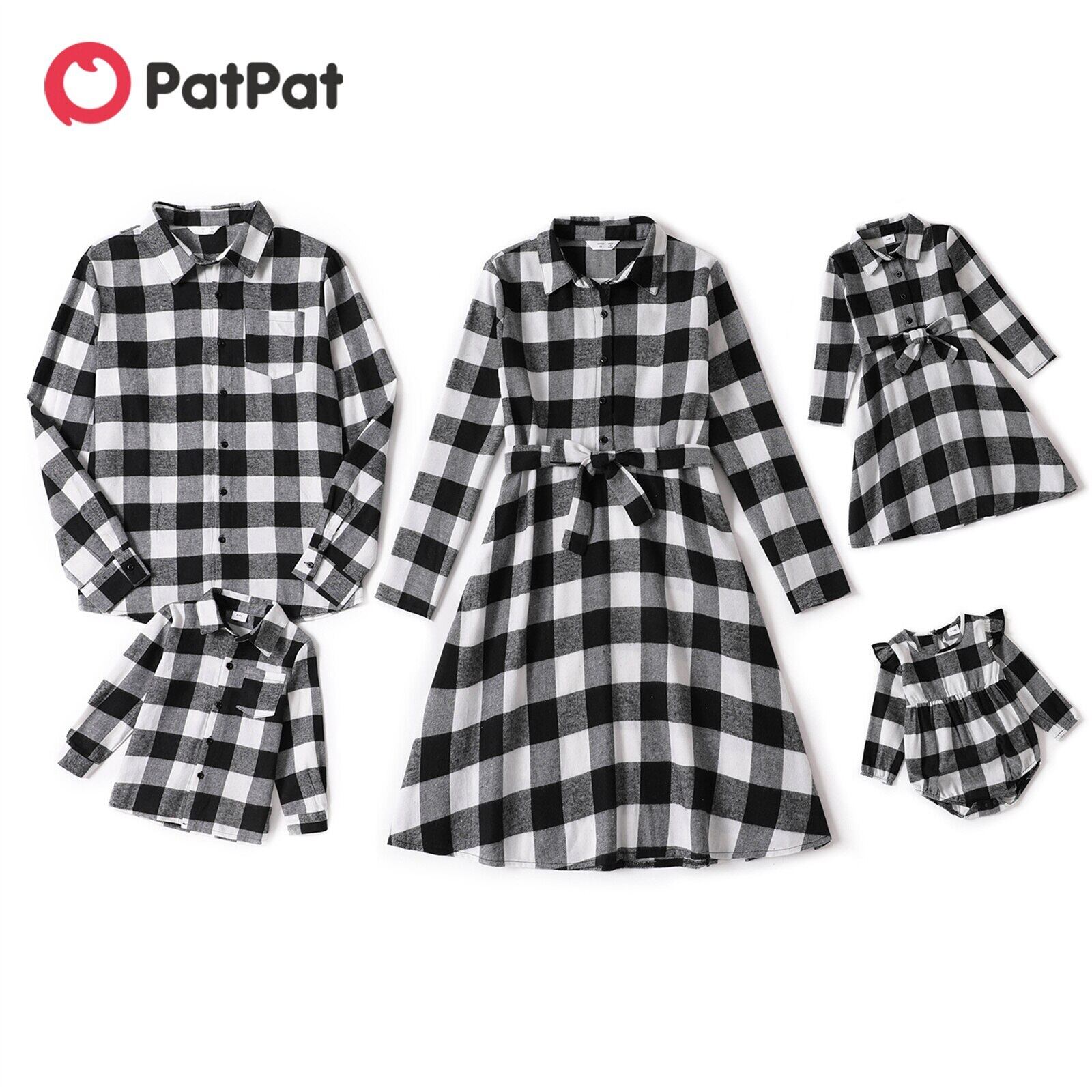 新作 PatPat クリスマス ブラック チェック柄 ファミリー マッチング ロングスリーブ ラペル ベルト付きドレスとシャツ セット