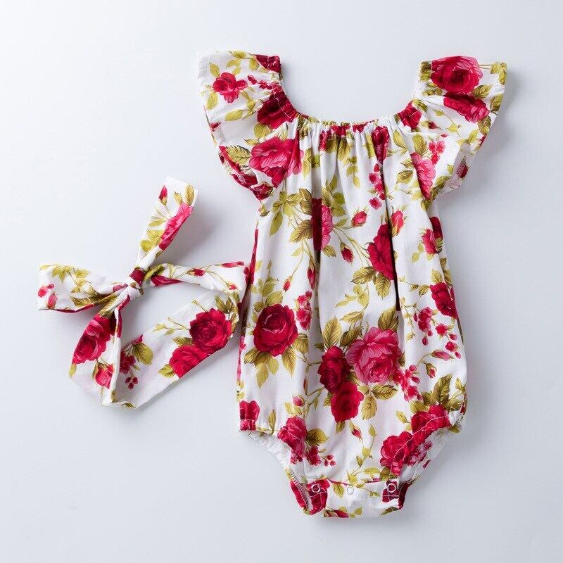 新作 夏かわいい花柄ロンパース 2 個女の赤ちゃん服ジャンプスーツロンパース + ヘッドバンド 3 6 9 12 18 メートル幼児幼児ボディスーツ新生児衣装