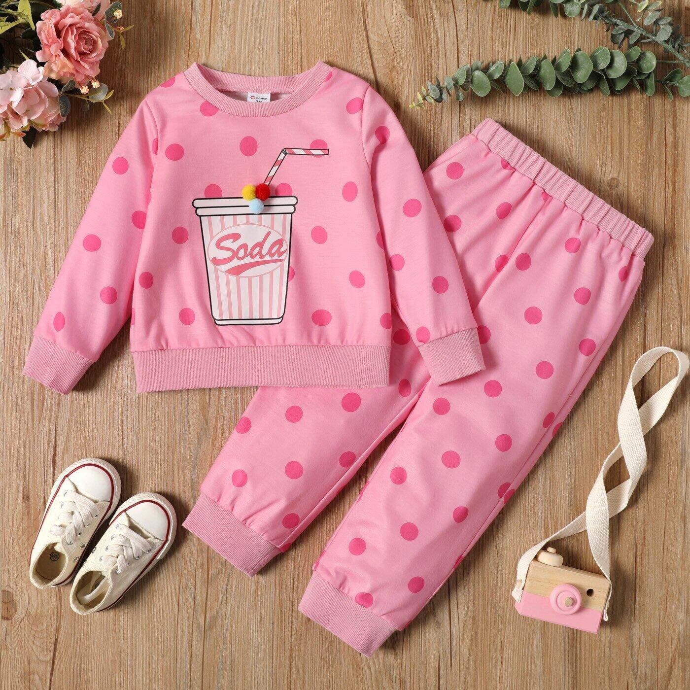 新作 PatPat 2ピース 幼児 女の子 水玉 ドリンク プリント ポンポン ピンク スウェットシャツと伸縮性パンツセット