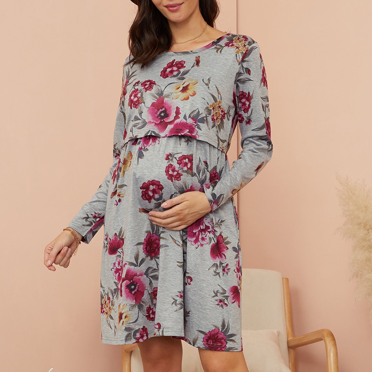 新作 PatPat 2021 マタニティ 丸襟 花柄総柄 膝丈 A 長袖 授乳服