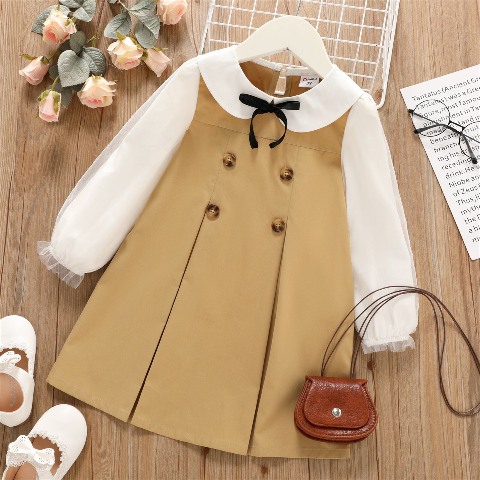 新作 PatPat 幼児の女の子の人形の襟ちょう結びメッシュ長袖カーキ ドレス