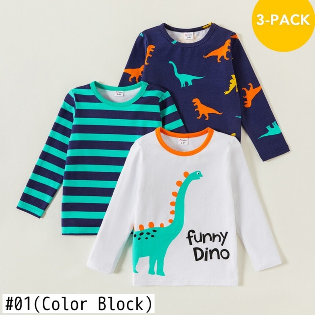 新作 PatPat 3ピース 幼児 男の子 長袖 Tシャツ 恐竜プリント ストライプ Tシャツ 男の子 春と秋服 3パック入り