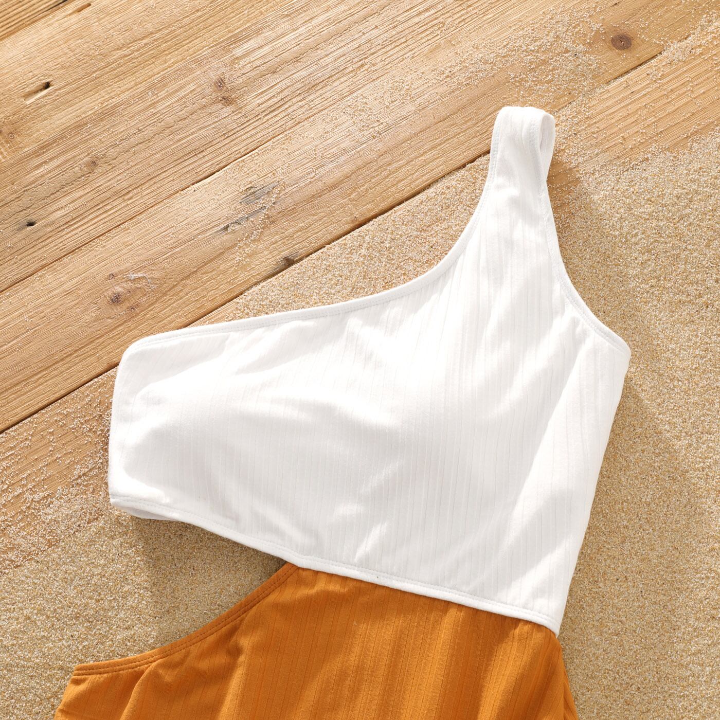 新作 PatPatファミリーマッチングレタープリントリブスイムトランクスショーツとワンショルダーホロウアウトスプライシングワンピース水着