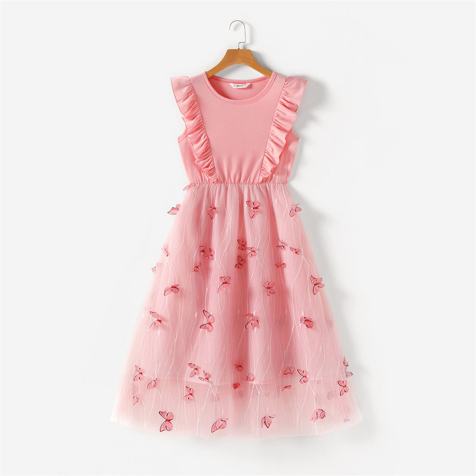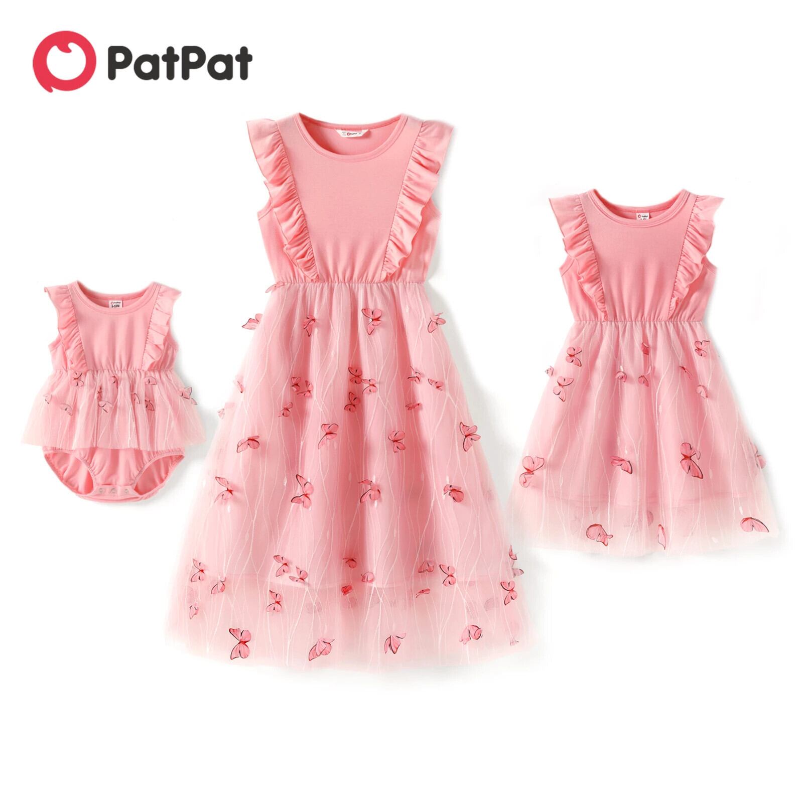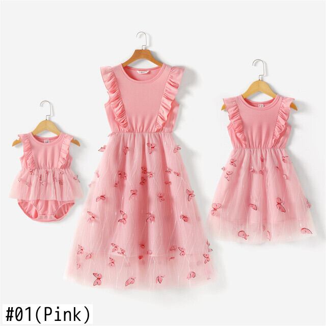 新作 PatPat ドレス ママと私 ピンク ラウンドネック フリル ノースリーブ スプライシング バタフライ 家族お揃いドレス 母と娘