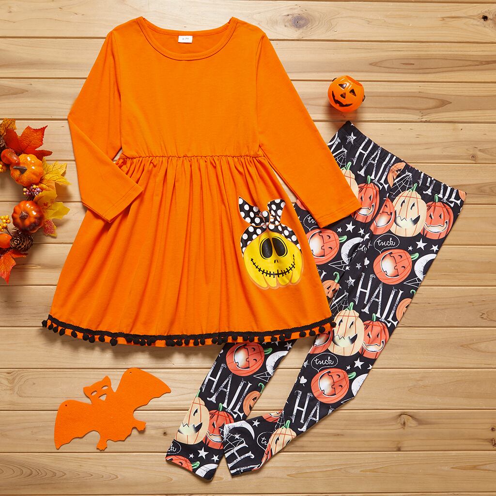 新作 PatPat s 2ピース キッド ガール パンプキン プリント ポンポン ヘム 長袖 トップスとレター プリント レギンス 服 セット