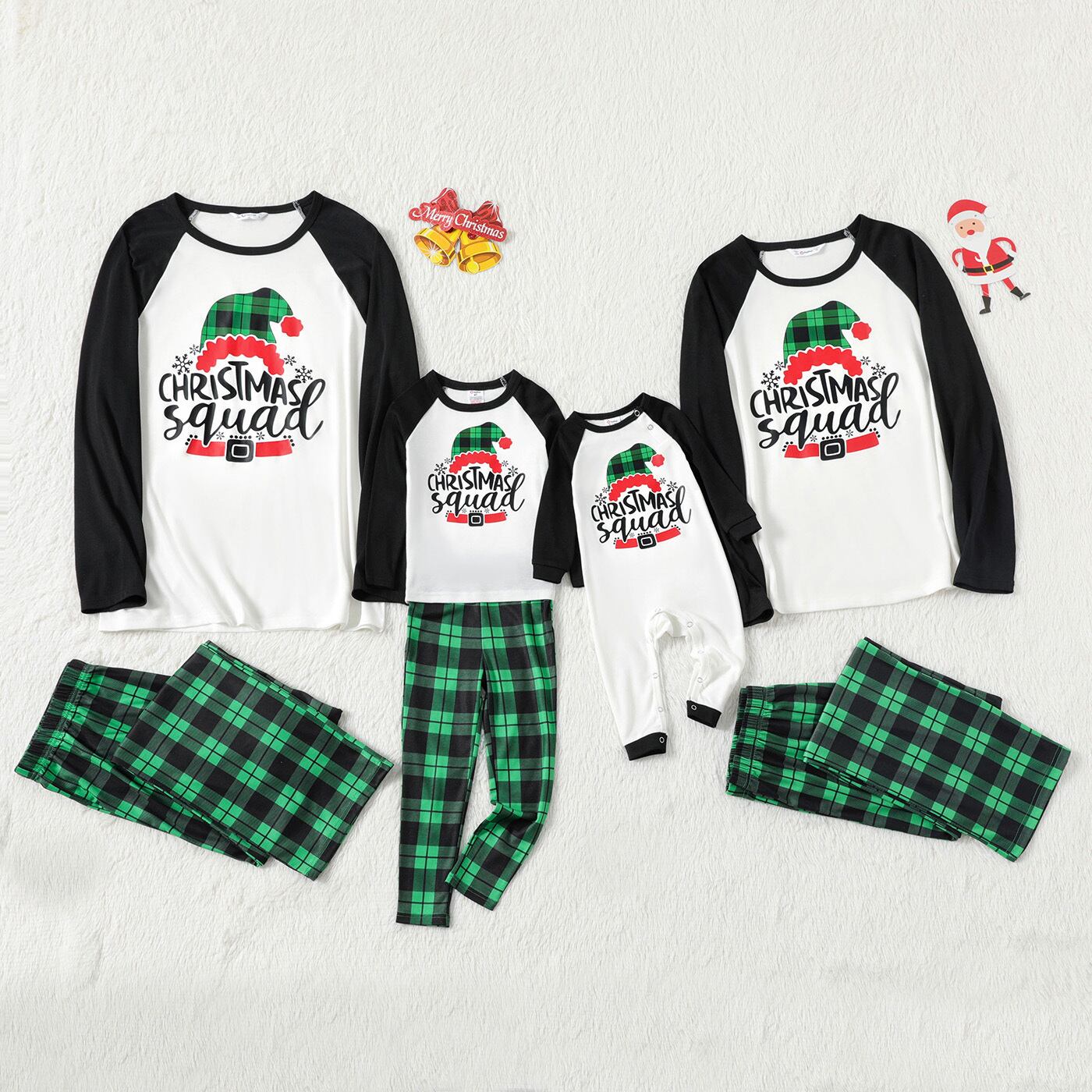 新作 PatPat クリスマス サンタとレター プリント ファミリー お揃い ラグラン 長袖 グリーン チェック柄 パジャマ セット (防炎)