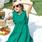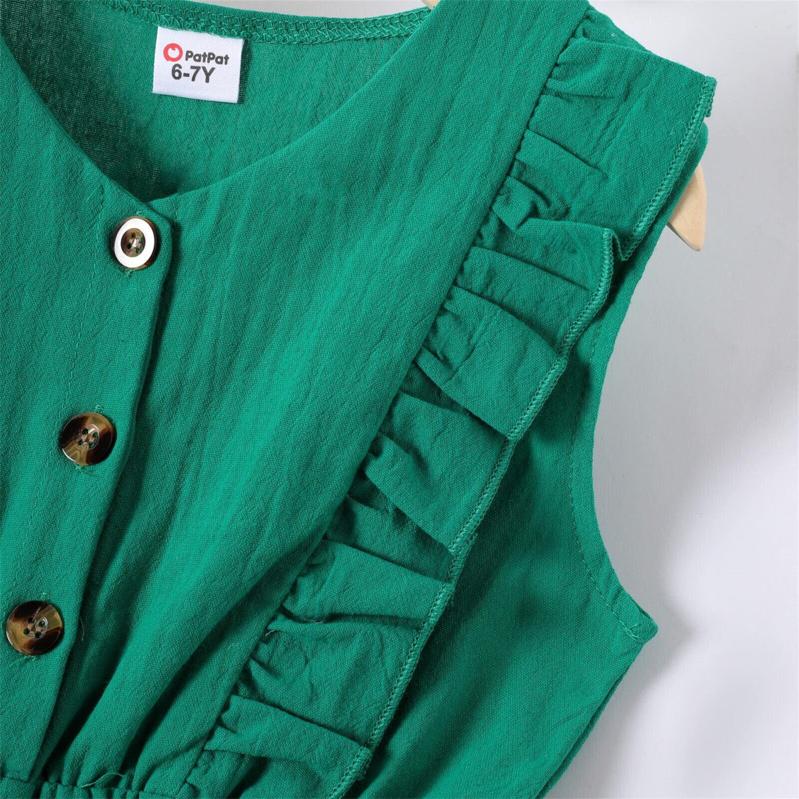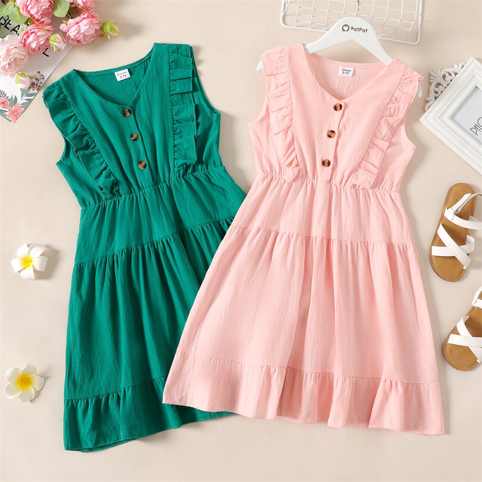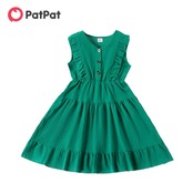 新作 PatPat Kid Girl 綿100% 無地 フリル ボタン Vネック ノースリーブワンピース