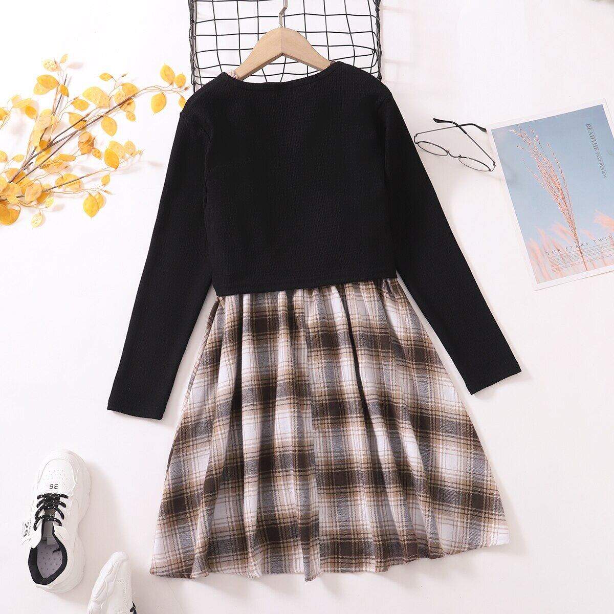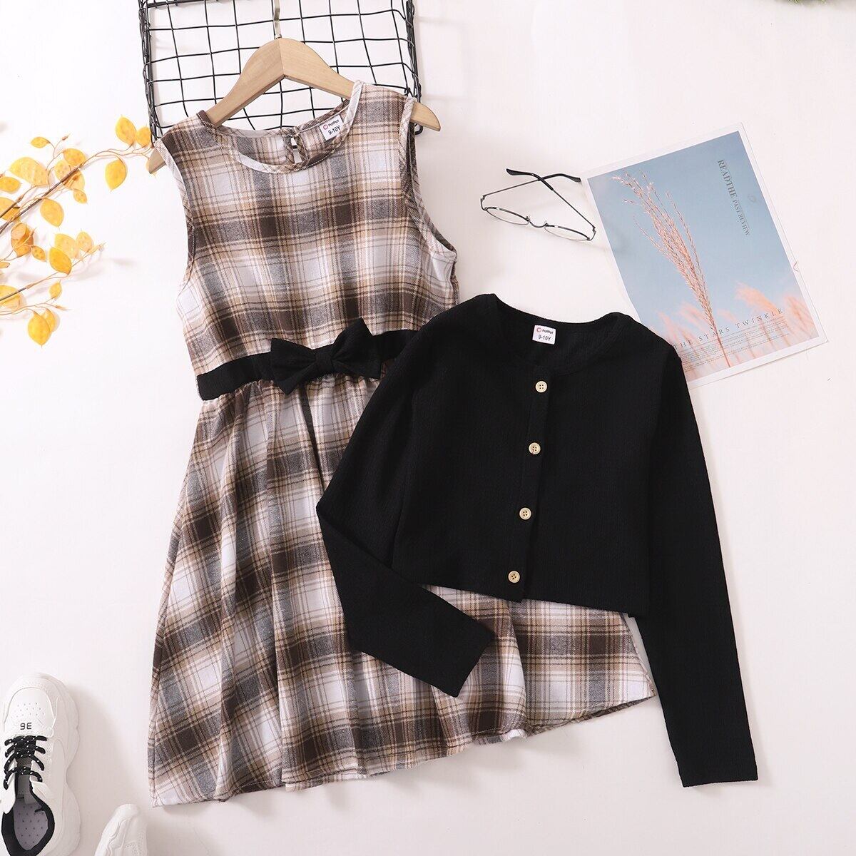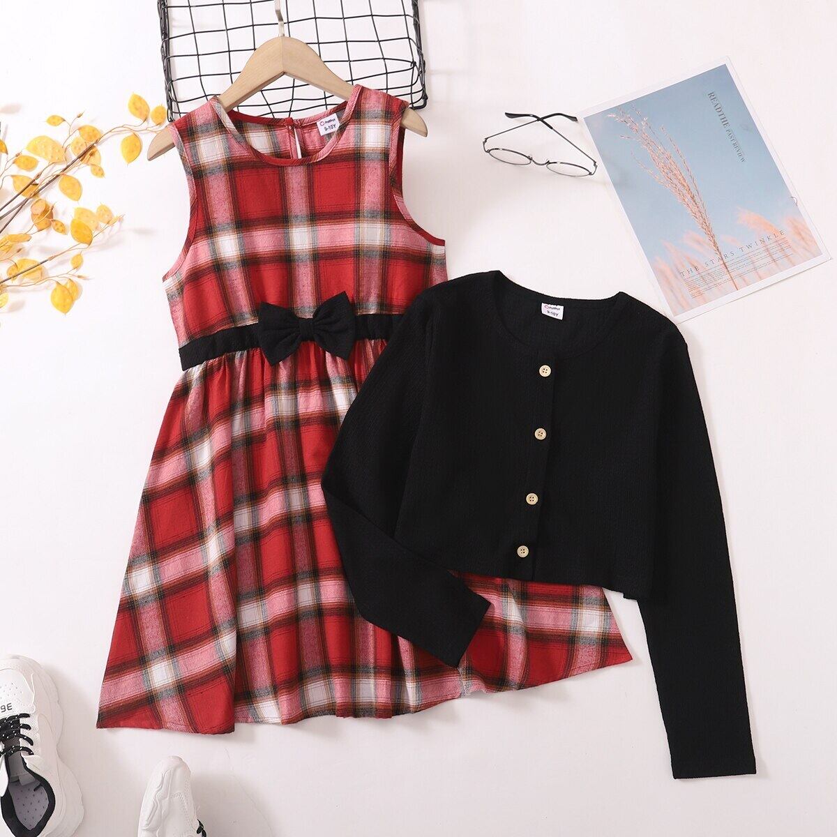 新作 PatPat 2 ピース キッド ガールちょう結びノースリーブ チェック柄ドレスとボタン ブラ