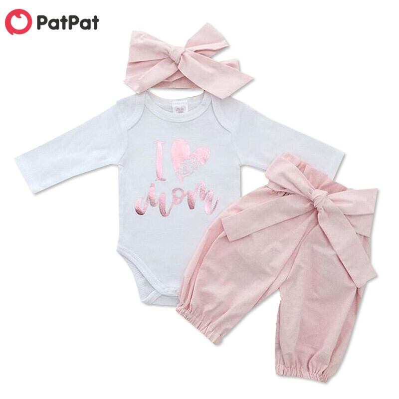新作 PatPat 春秋綿生まれレタープリント長袖ジャンプスーツ無地パンツ弓カチューシャセットクローラースーツ