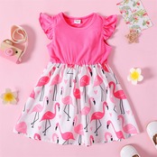 新作 PatPat 幼児 女の子 リブ フラミンゴ 総柄 フリル装飾 フラッタースリーブ ドレス