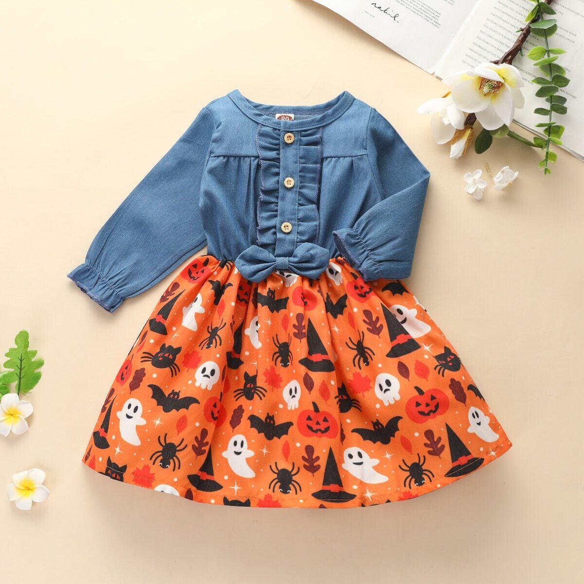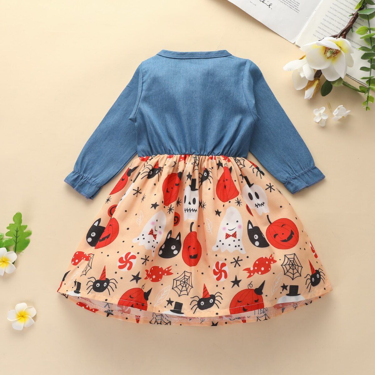 新作 PatPat s デニム スプライス スタイル 服 プリント 長袖 ベビー ガールズ ドレス