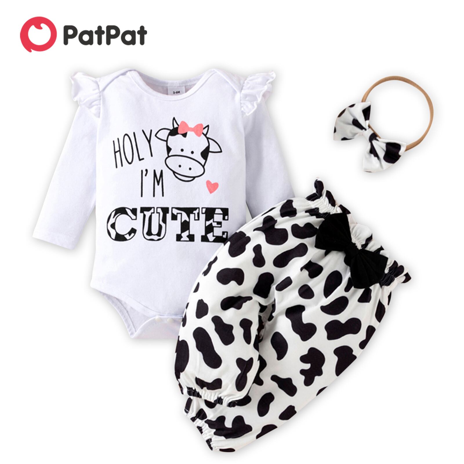 新作 PatPat 3ピース ベビーガール レターとカウプリント ホワイト 長袖ロンパースとちょう結びズボンセット