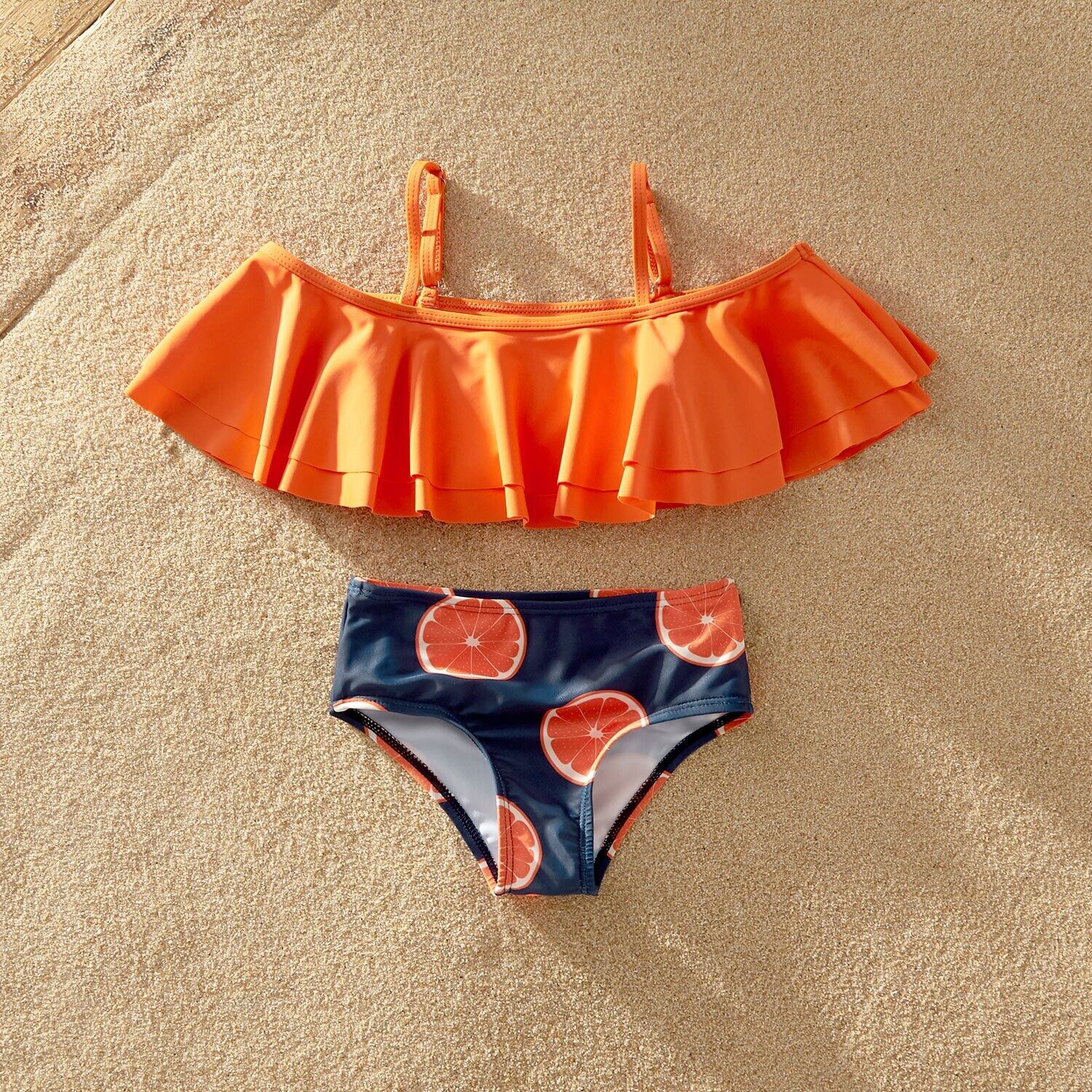 新作 PatPat 2021 夏 オフショルダー フリル グレープフルーツ プリント お揃い 家族水着